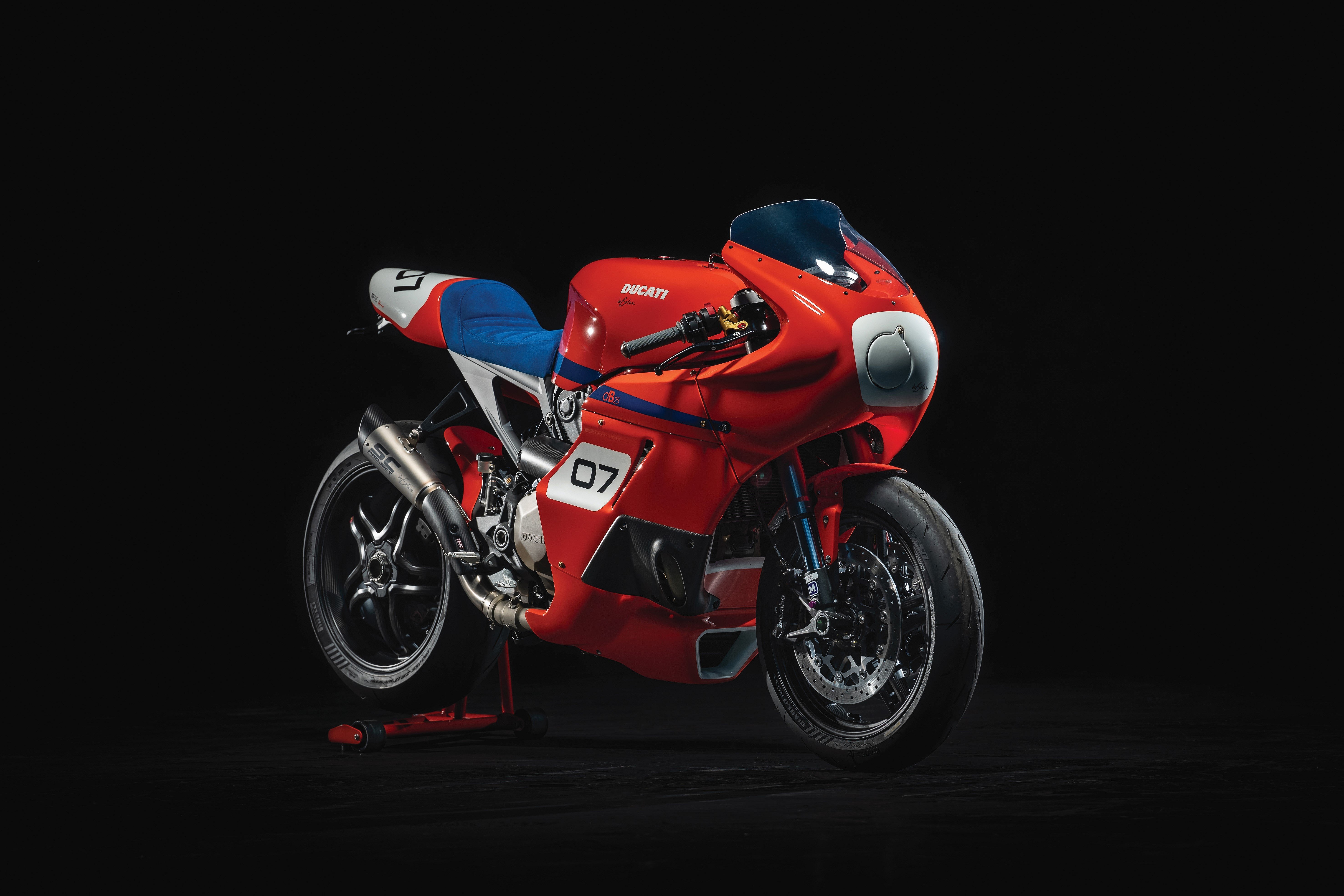 The color is taken from the 1960s Ferrari Dino, named after Enzo’s son, and named Rosso Dino. We painted the Dino logo into the No. 7 tail section as a homage to this too. The bright blue stripe and Alcantara seat is also something seen on early Ferraris and a feature that ties in well. And we’ve also finished the engine covers and swingarm in Cerakote.”