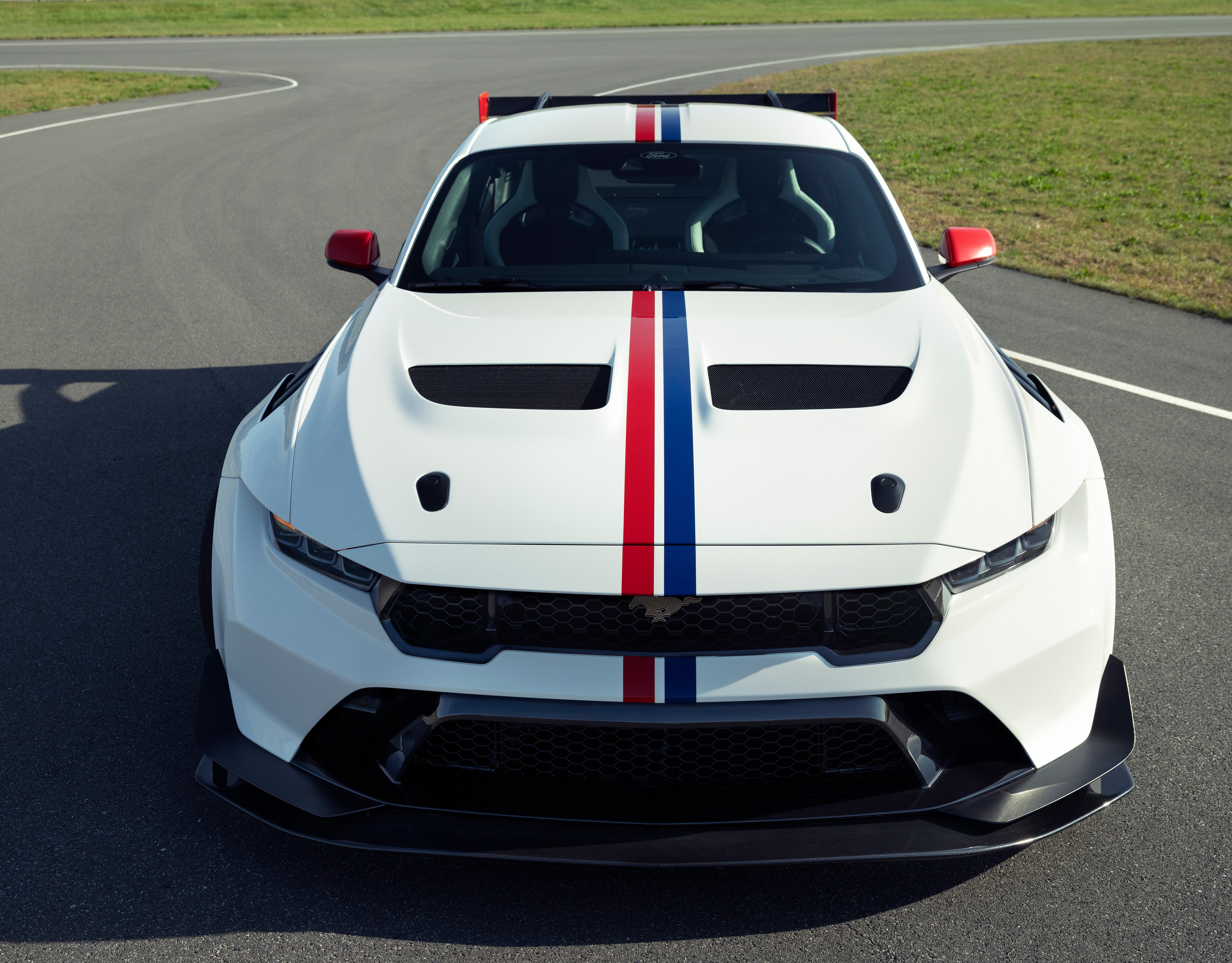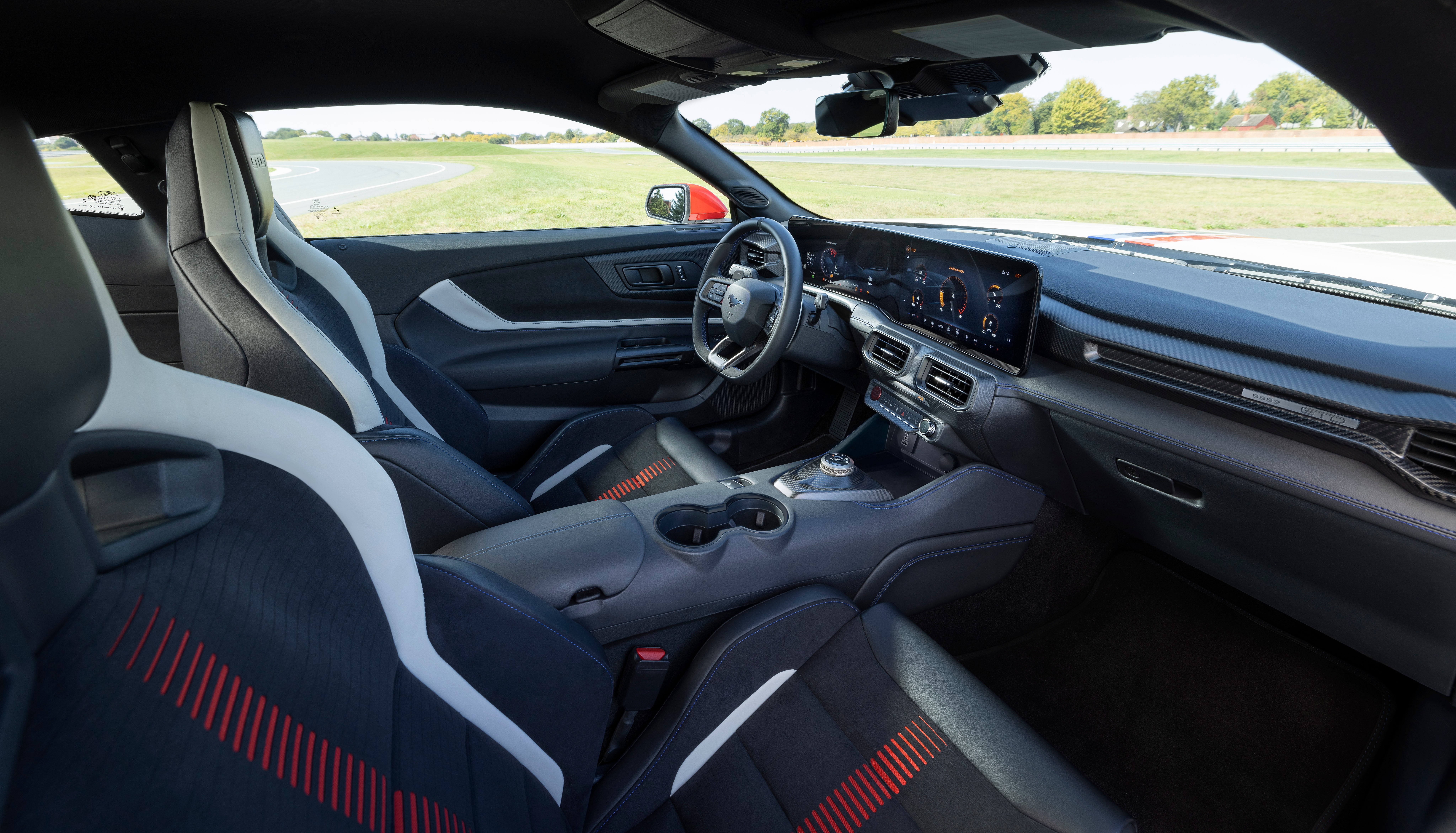 With those moments in mind, Ford Design conceived a Performance White body with twin body-length racing stripes in Race Red and Lightning Blue, mimicking the iconic red, white, and blue Mustang tribar that debuted in 1964. The design also matches the overalls that Breedlove wore when he took his land-speed records. Exposed carbon fiber features on the front splitter, rear diffuser and spoiler—the latter also gets Race Red end plates and a “MUSTANG” wordmark on the underside. Owners have a choice between Race Red or exposed carbon-fiber mirror caps, while Race Red calipers are standard.