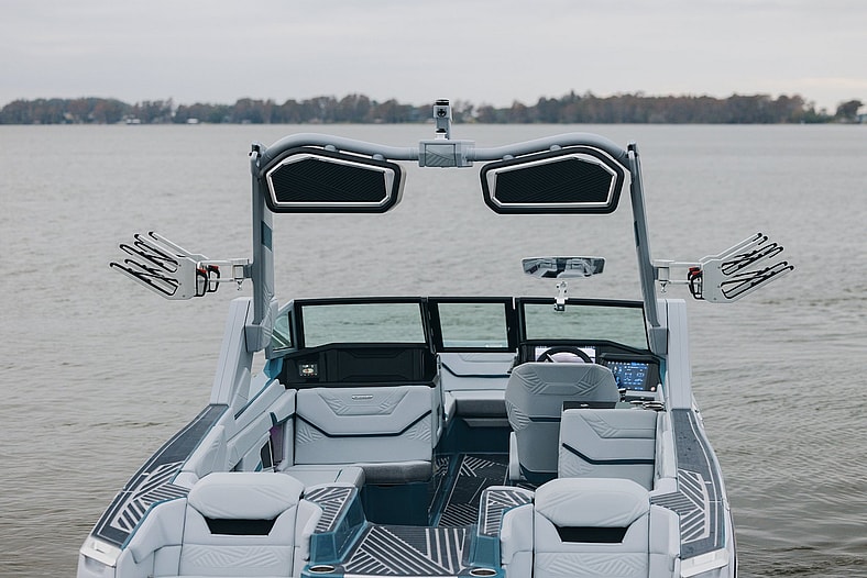Among the XStar’s many next-gen upgrades is the MasterCraft Aft Audio Experience (MAAX), featuring six subwoofers, ten interior cockpit speakers, four tower speakers, and six transom speakers that provide 4,200 combined watts of peak power—MasterCraft points out that this is 100 percent more wattage than offered by current competing systems. Though the U-shaped cockpit accommodates a maximum recommended occupancy of six, the MAAX system brings seven customizable audio zones, including dedicated zones in the tower and transom.