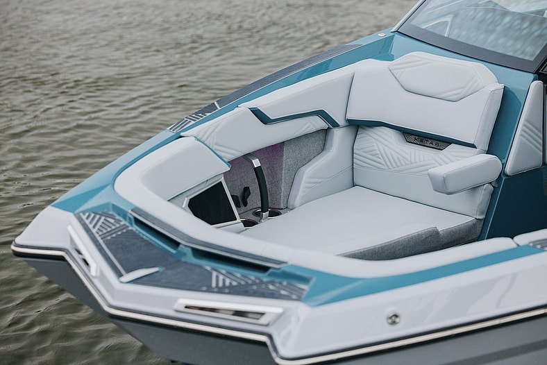 Those six passengers will surely appreciate upscale new transom loungers and the modernized picklefork bow, with its built-in armrests and customizable seating options clad in a variety of color combinations—Dark Gray over Storm Gray, Charcoal over Black, Dune over Cappuccino, and Mocha over Charcoal. Additionally, a revamped A-frame structure behind the helm seat can now be transformed into a rear-facing seat, a social table, or a valuables tray. This modular feature provides an extra storage drawer in the base if left stock, but it can also be optioned with an integrated refrigerator.