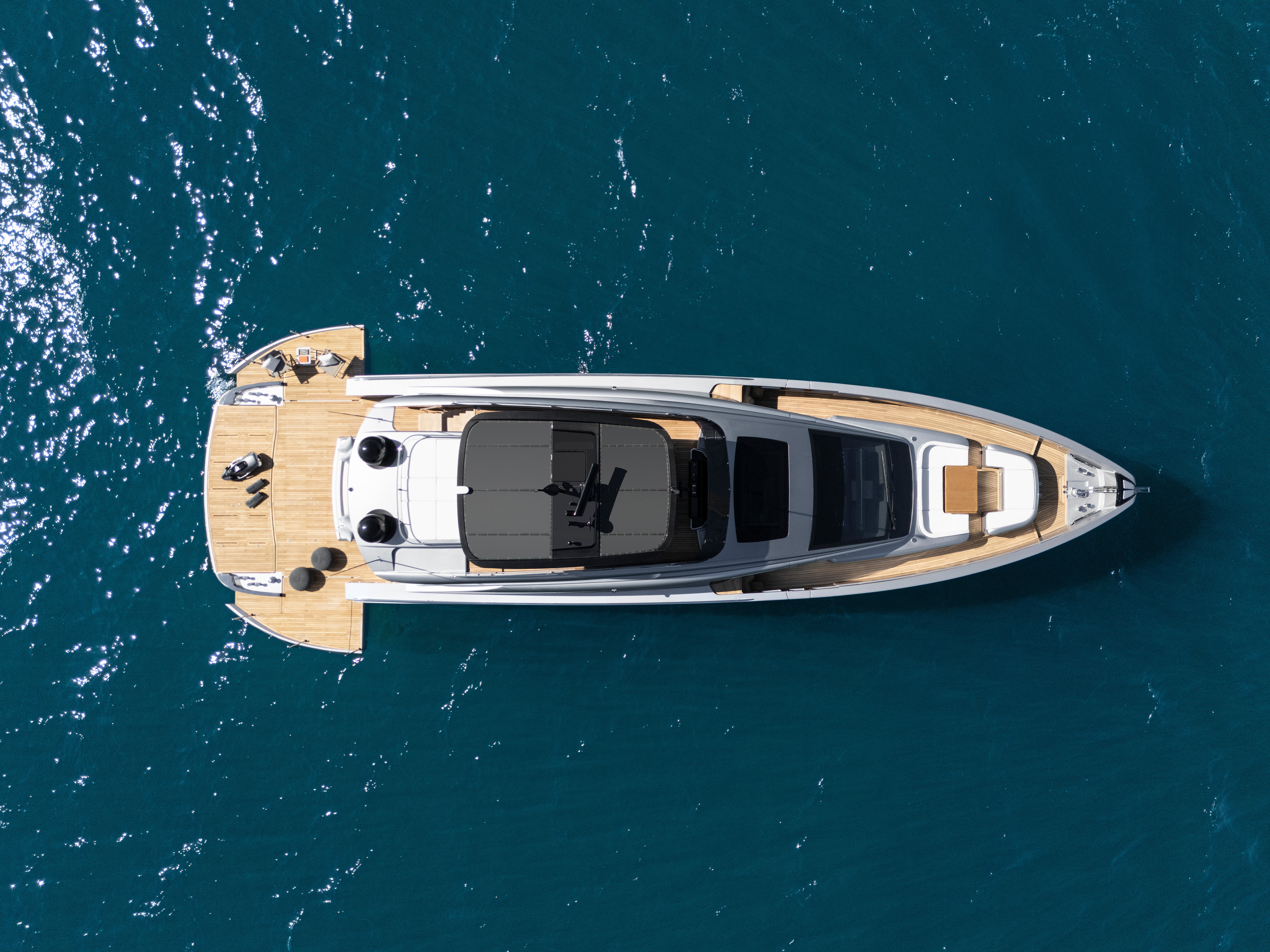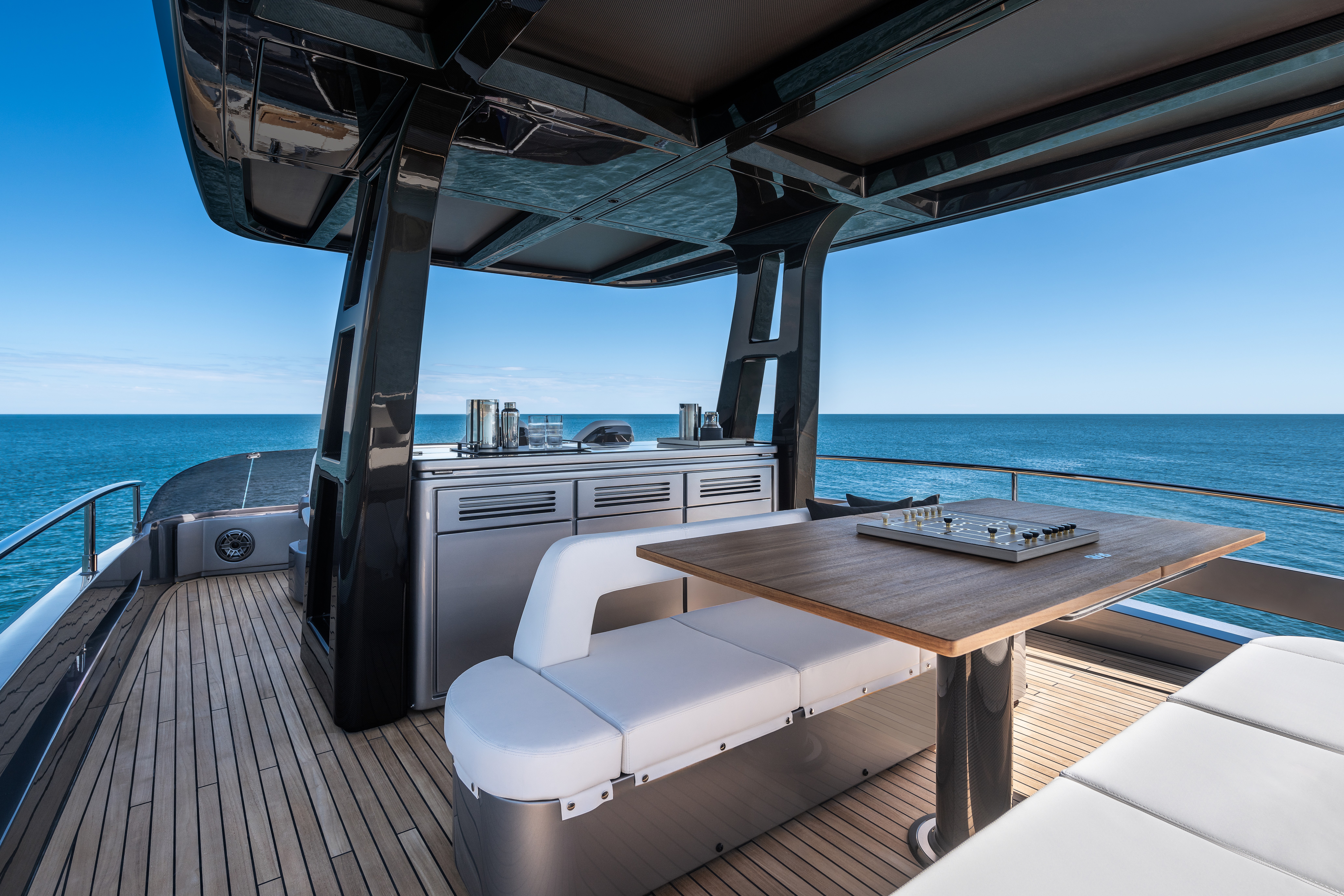 The stern’s main deck is likely the greatest attraction when anchored. The beach area on the first level boasts and impressive 300 square feet of space of modular space, thanks to a multi-position stern platform. Its default position is designed to launch tenders, but it can also be elevated a few feet, at which point lateral terraces simultaneously unfold from the hull, maximizing space by joining the deck with the stern. Up front on the main deck’s bow is a raised helm station with three monitors, a Simrad navigation