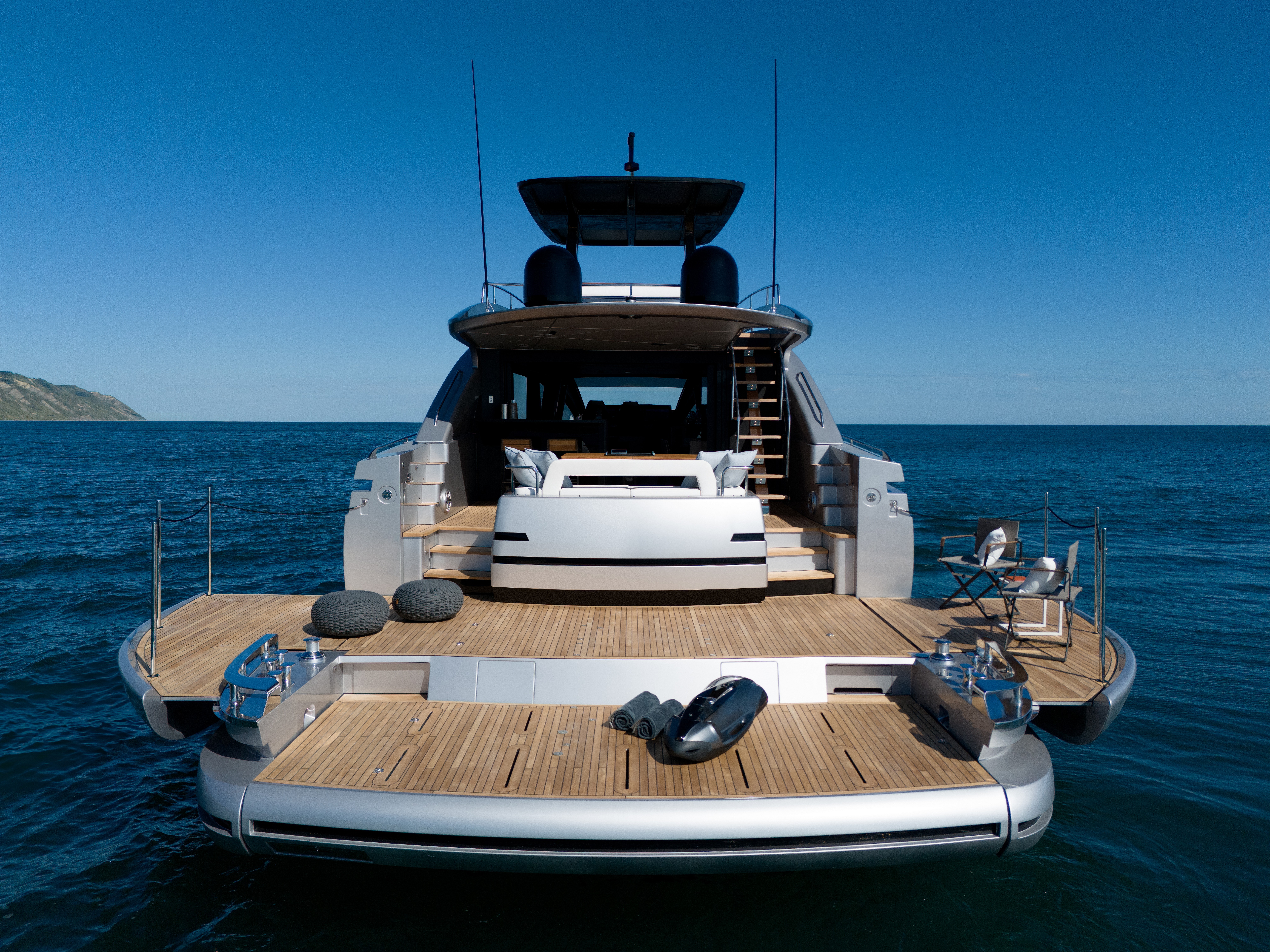 The brand points to elements such as the hull’s silhouette, which features a nearly vertical bow that’s intersected by a slightly rounded convex sheerline. The sheerline’s form also plays elegantly with the hull’s curves, which are highlighted further by the classic Pershing gray color that also covers the superstrcuture above.