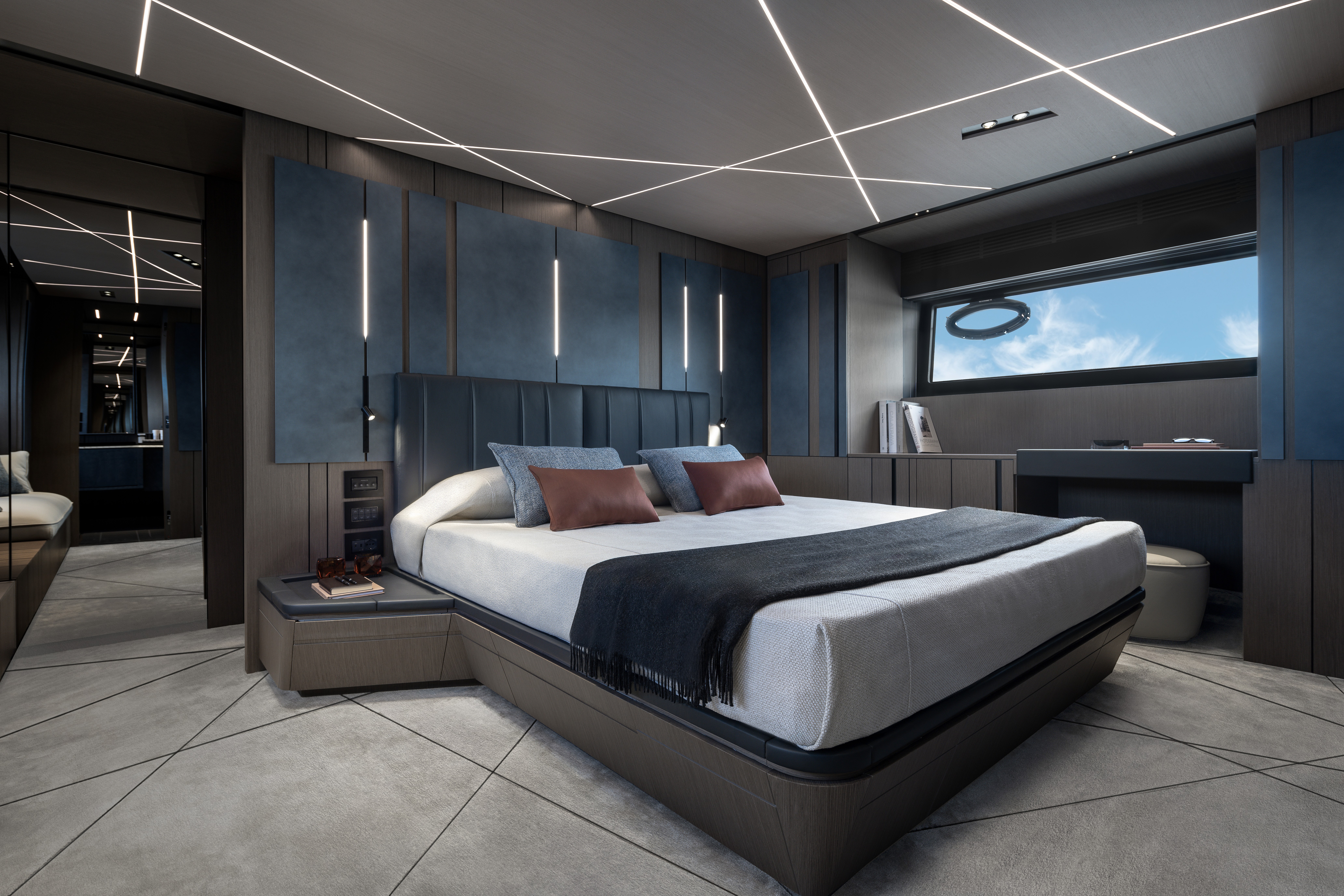 Above the second level is the 250-square-foot flybridge/sundeck with a bar unit and more seating. And all the way below deck are four cabins with as many en-suite bathrooms—the fourth unit can be replaced with a dinette and day head. The entire interior is clad in sky-blue leather paneling, while the rooms feature TVs, metallic lacquered bathroom walls, and more vertical strips of light.