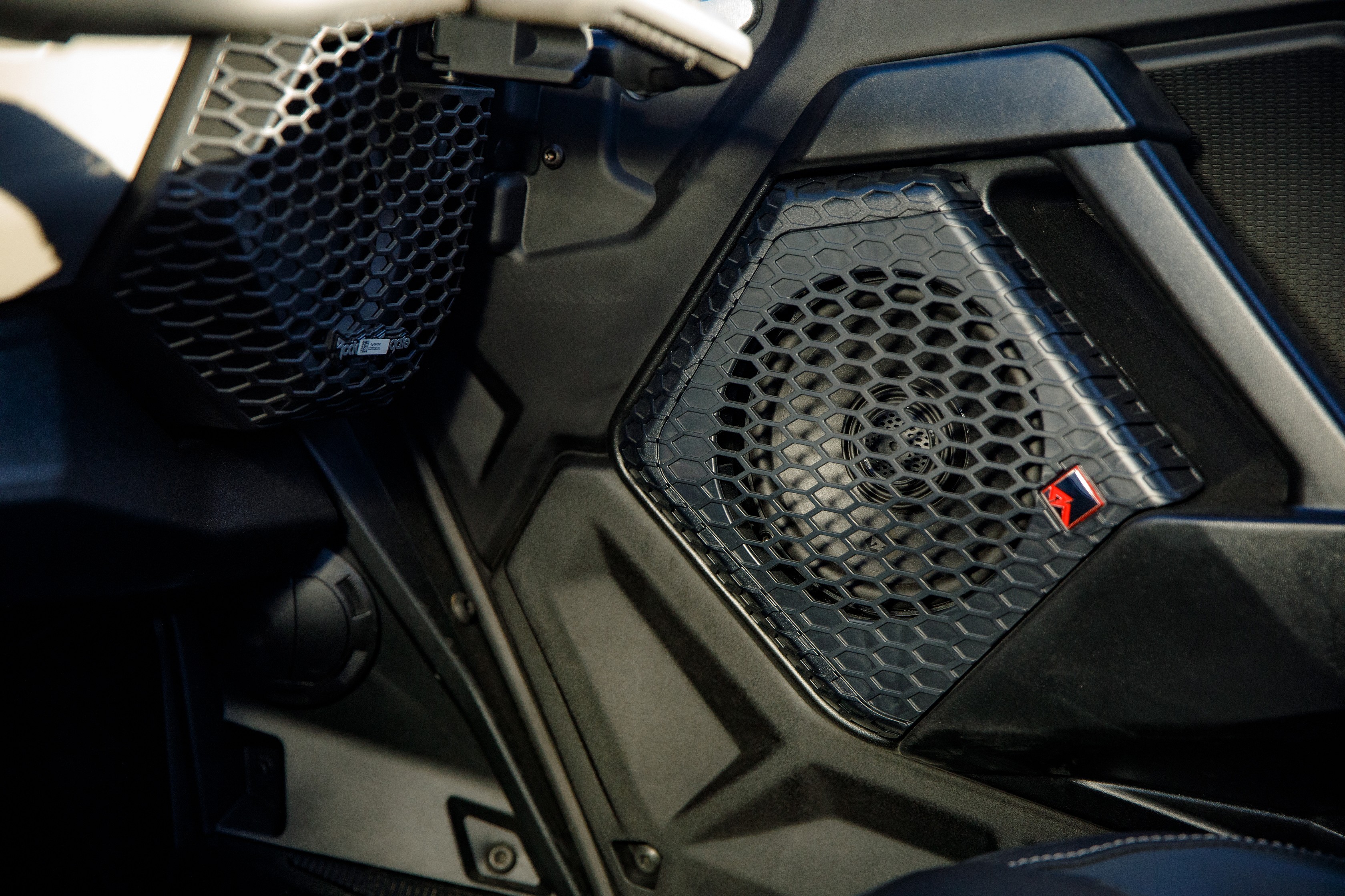 While the 225-horsepower 2.0-liter four-cylinder and continuously variable transmission remain stock, there are several other Race Replica-specific upgrades to note. The Polaris-engineered front and rear bumpers are more robust than ever, as are the Method 407 bead-grip wheels wrapped in formidable BFGoodrich 32-inch tires. Off-road illumination specialist RIGID also contributed a couple of components: a 32-inch lightbar that’s incorporated into the roof and capable of a 20,000-lumen output that travels up to 3,077 feet, as well as a chase light that combines running, brake, reverse and turn-signal lights in a single package. Powersports audio brand Rockford Fosgate also outfitted the RZR Pro R Race Replica with its top-shelf Stage 6 Audio system, which features a 12-inch 400-watt subwoofer, a bass-control knob, and front-door speakers