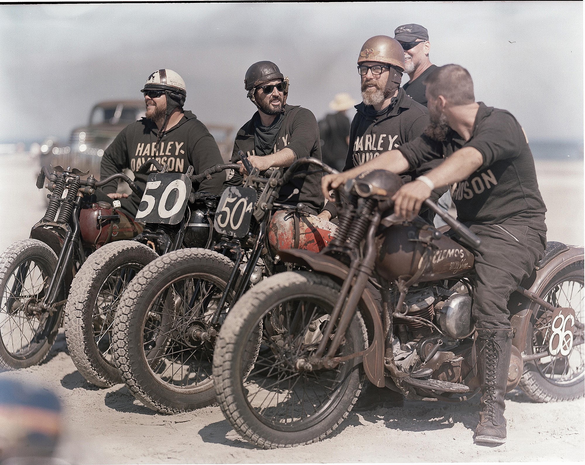 Take a closer look and you’ll find the racers themselves decked out in period-correct garb, with half-helmets and leather-strapped goggles covering one half of their face, while loosely groomed beards and cigarettes hide the other half. As written in the book’s introduction, T.R.O.G. “commemorates a time when bravery and stupidity looked more alike, when the earliest iterations of [vehicles] drove onto long strips of beach to go faster than ever before.”