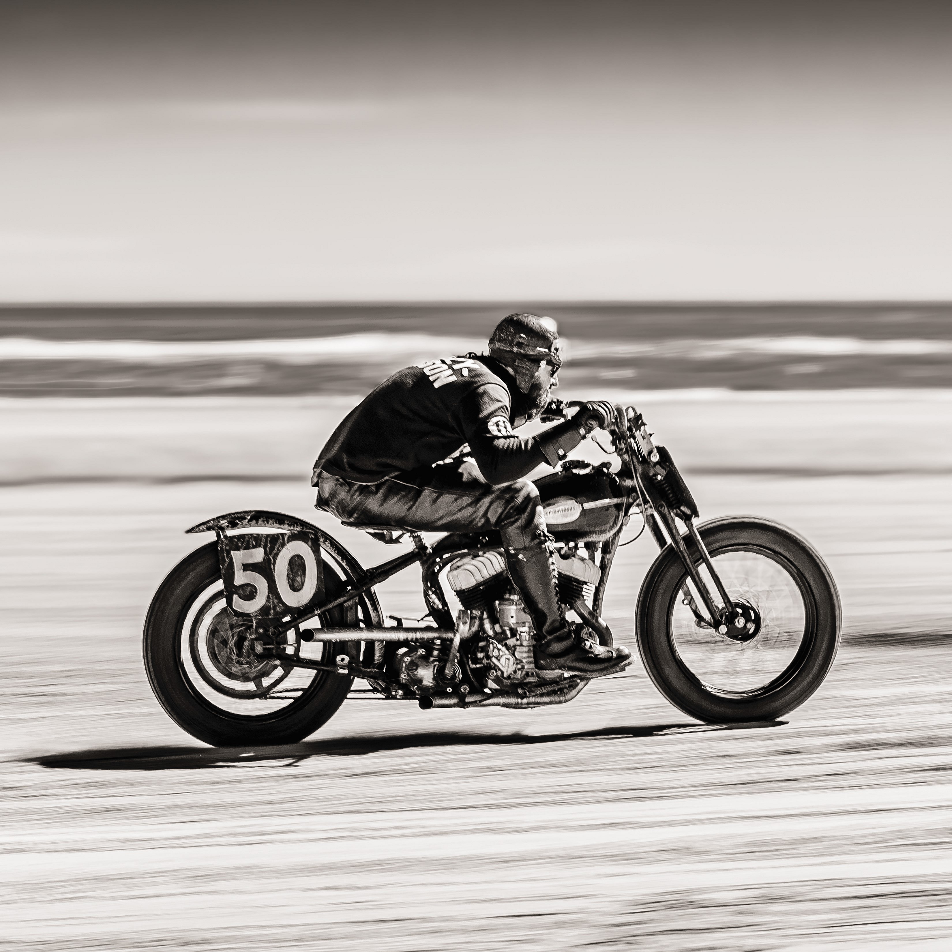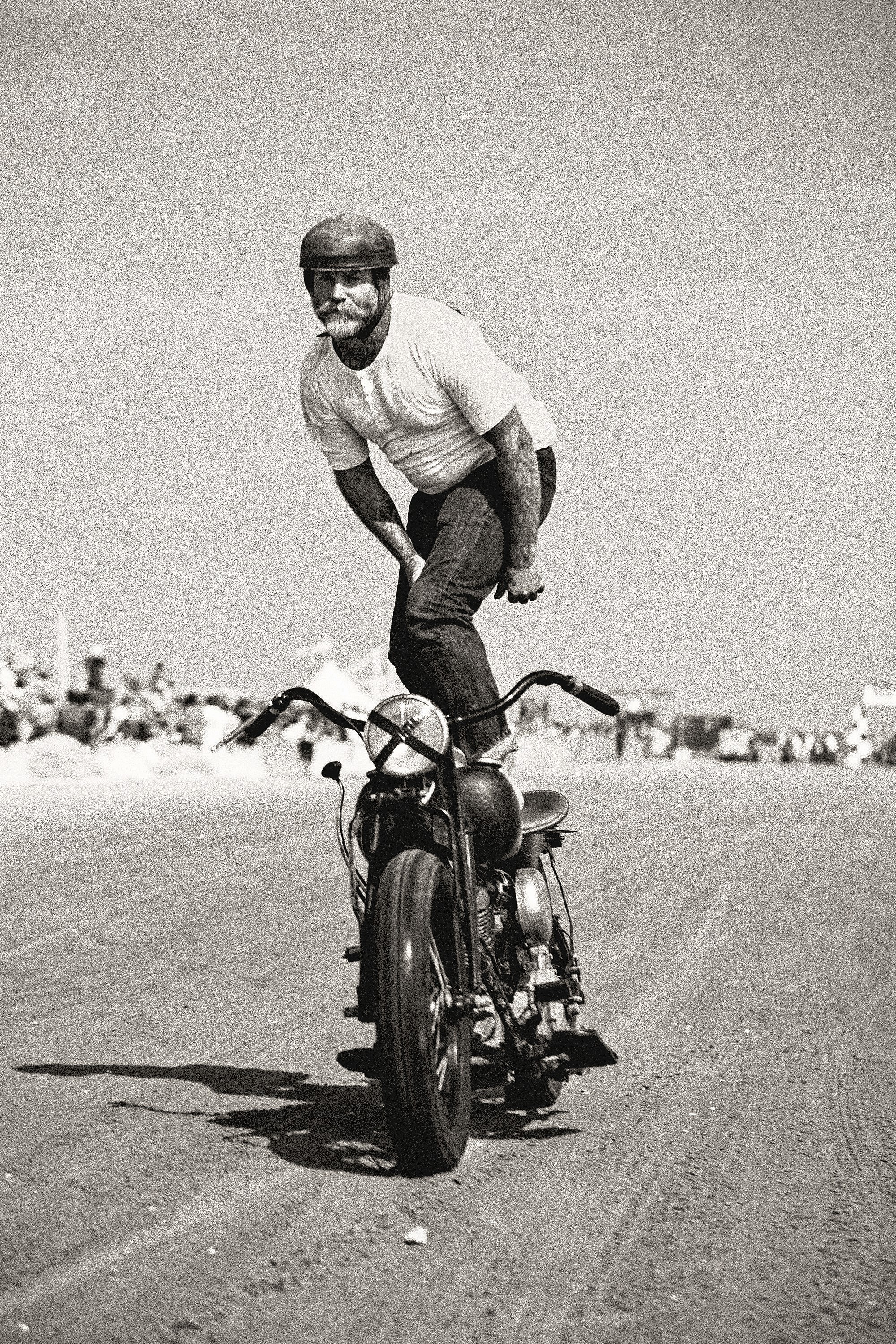 The OG Indian Scouts and rival Harley-Davidson WRs that jump off the page with even a cursory flip through Assouline’s The Race of Gentlemen allude to the high-octane spectacle’s biggest point of appeal: All motorcycles seen rooster-tailing down the beachy, eighth-mile drag strip must be bobbed, American-made, and produced in or before 1947.