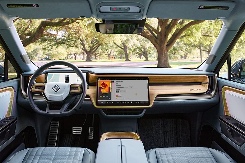 There are few actual buttons on the dash and doors; most features beyond power windows and driving are controlled by the screen. For those of us who like a tactile experience of buttons and knobs, this takes some getting used to. Things like adjusting a side-view mirror that you’re used to knowing where the knob is, you’ll find behind a menu in the Rivian. A drawback for some, but a major benefit to the lack of knobs and buttons is that new software updates can improve the functions of a vast number of features because they’re all controlled by the same brain. Whereas in other vehicles, the one function mapped to that one button will never change.