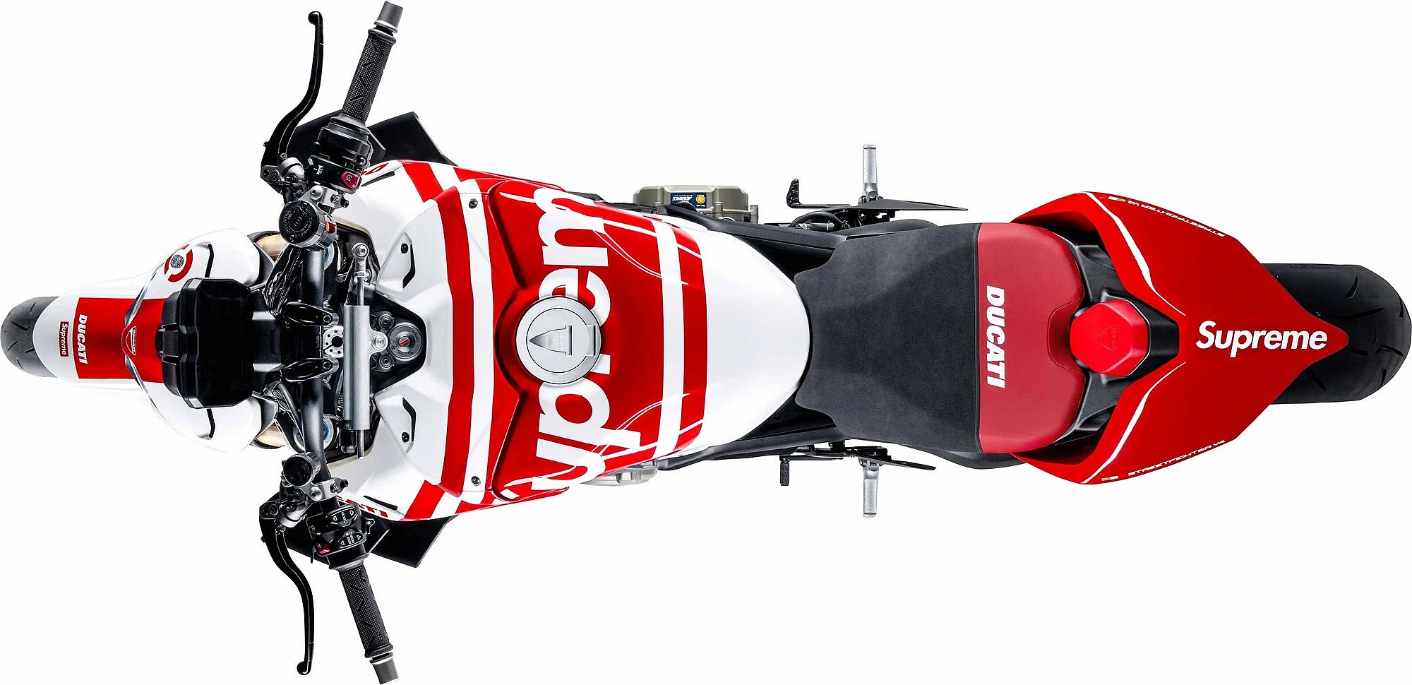 Supreme, the undisputed king of lucrative crossbranding, has adorned the Ducati Streetfighter V4 S with its signature red and white logo.