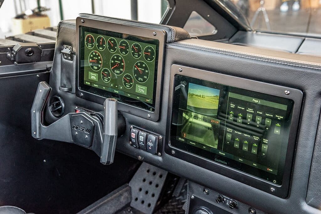 Everything is protected by a welded tubular exoskeleton, most importantly the “floating” passenger compartment secured by an air-sprung system. Entry through gullwing doors reveals a surprisingly plush interior, with heated and cooled Recaro seats, a Bose aviation intercom, and dual 12-inch Garmin touch screens.