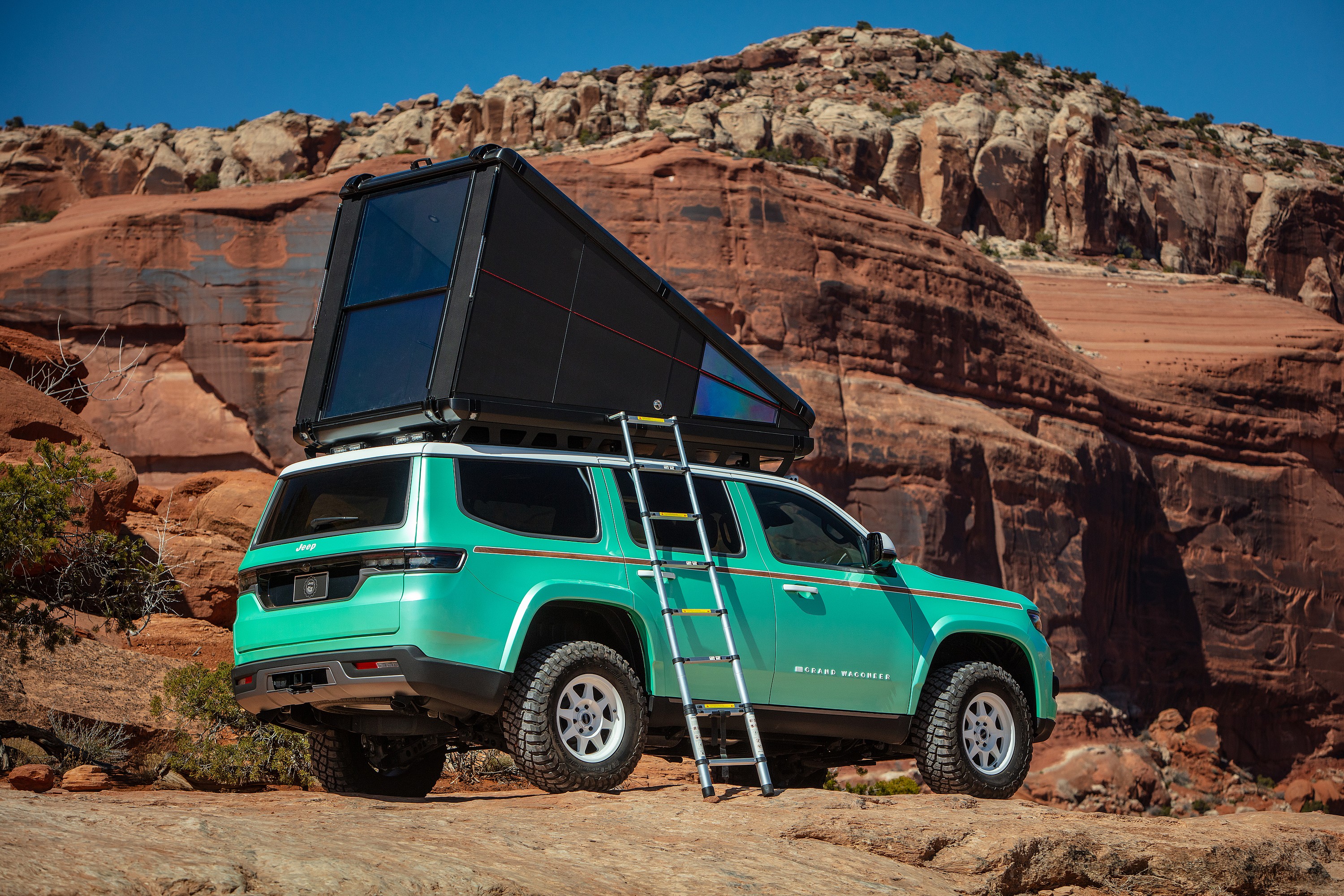 Jeep’s half-ton Gladiator pickup is imagined as the High Top concept and sports perhaps the coolest paint job—a two-tone black and “Ginger Snap” metallic coat. The final Grand Wagoneer-based “Vactioneer” concept is ready to glamp with a roof-mounted RedTail Overland Loft featuring climate control and panoramic windows.