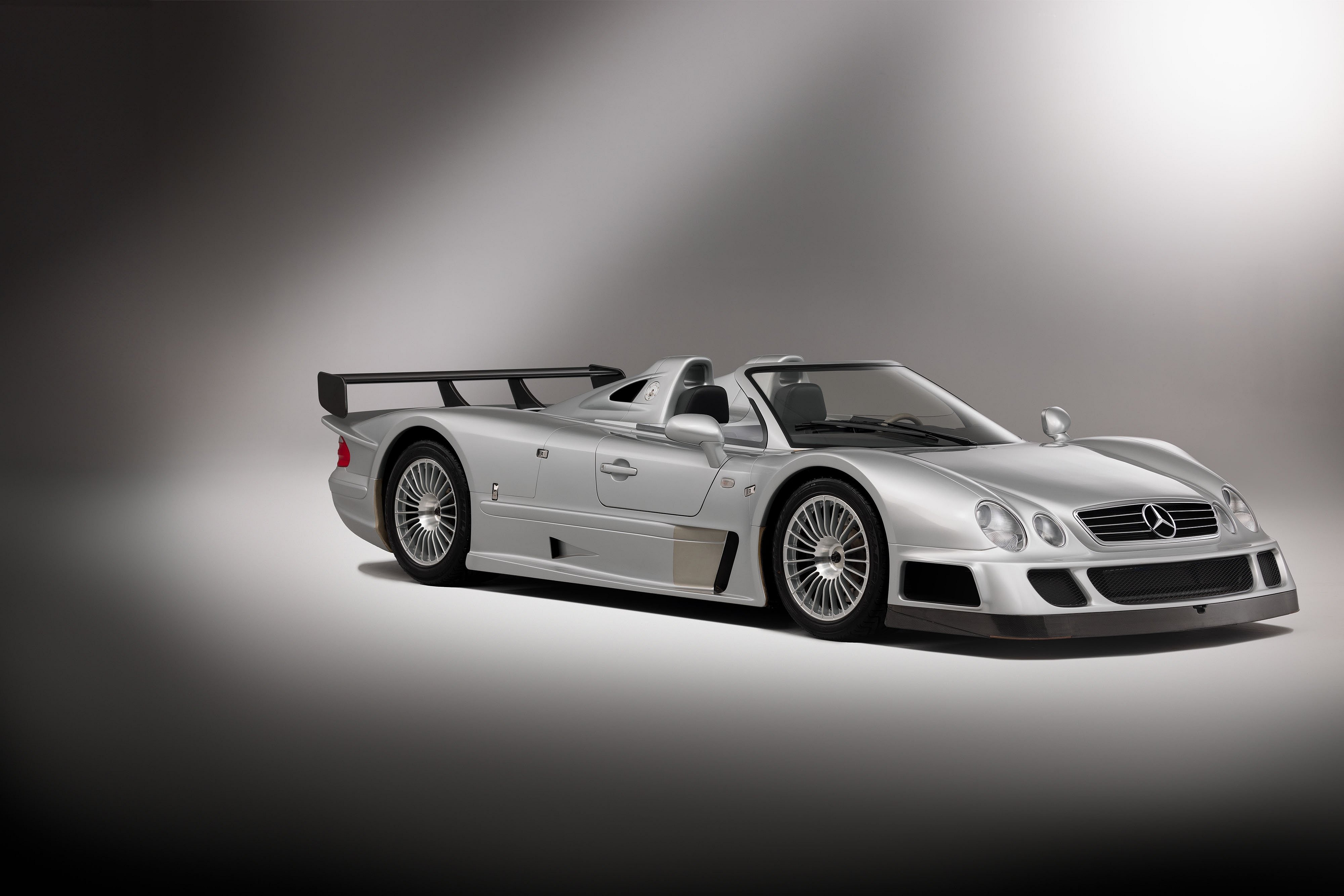 Only six of the 26 CLK GTRs were topless Roadster variants built after the Coupes’ production run. And the third of six CLK GTR Roadsters produced is the one seen here, chassis 000034, finished in silver paint over a black and gray leather interior and showing just 25 kilometers (16 miles) on the odometer.