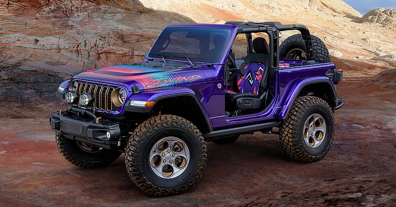 The Jeep Wrangler and Gladiator Rewinds come from the concept of the same name, a 2025 Wrangler Rubicon-based Easter Safari concept that kicked it back to the days of Depeche Mode and Mötley Crüe with vividly custom-painted CJ7s, YJs, and, eventually TJs. Designers, many of whom are children of the 1980s and 1990s, channeled the brightly colored Wranglers of the decade while also tapping into gaming and early digital design.