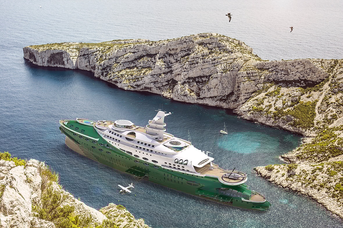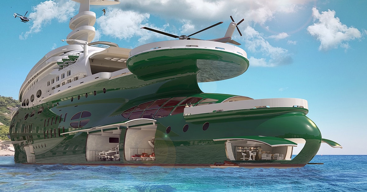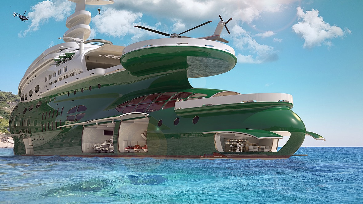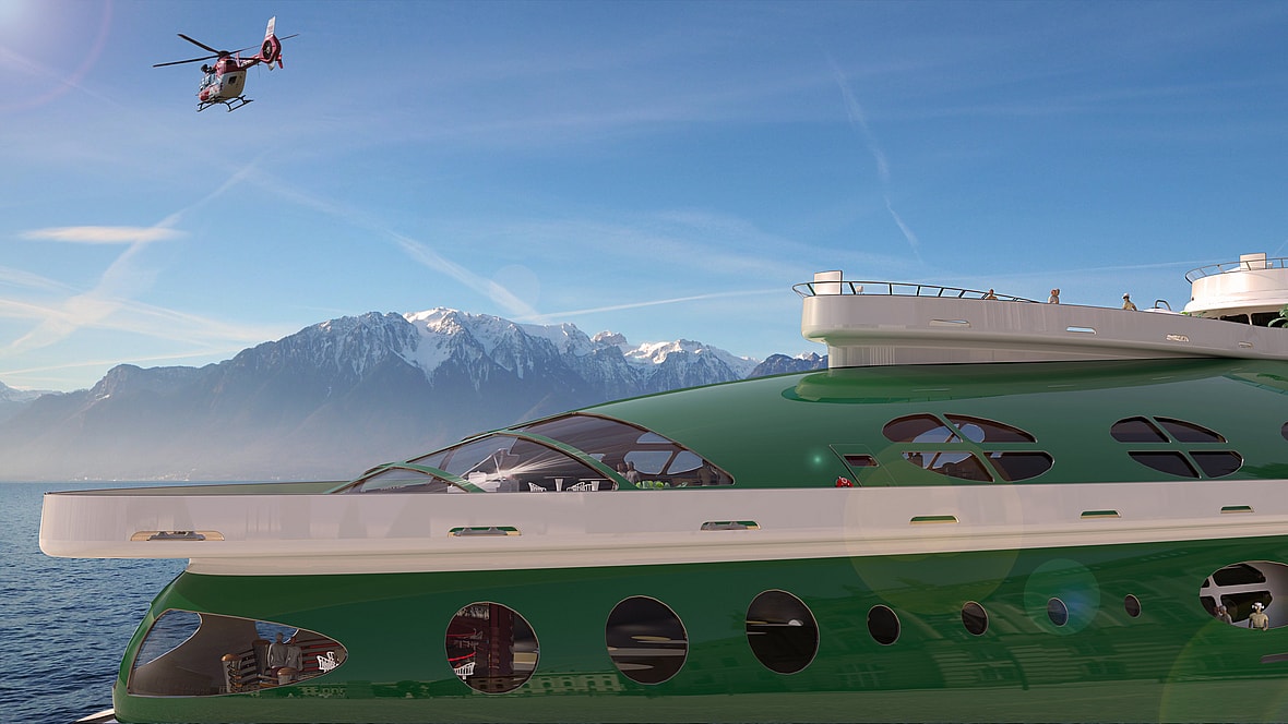 Even the propulsion system is ambitious. Kozloff imagined rotating azimuth thrusters, powered by batteries that are charged by “green fuels of the future”—hydrogen, methanol, and biodiesel are all on the table.