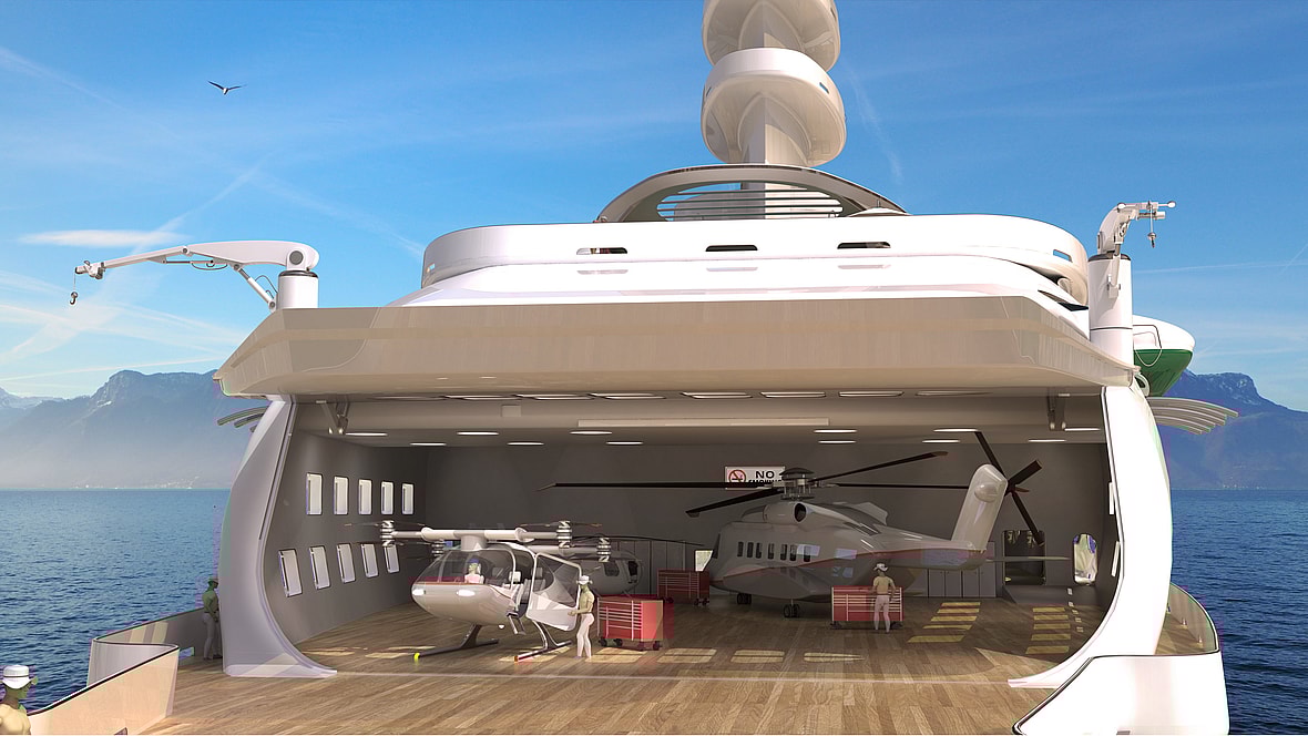 Among its most ambitious features is a 6,500-foot aircraft hangar designed to house two Sikorsky S-92 VIP helicopters, various other smaller helicopters, and an electric VTOL craft of Kozloff’s own design for transporting personnel. A separate hangar at midship stores two Cessna Caravan Seaplanes, selected for their ability to transport resupply across long distances.