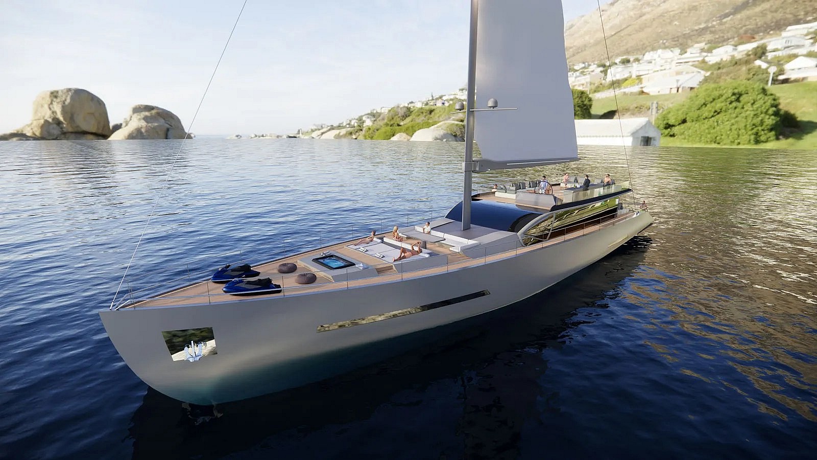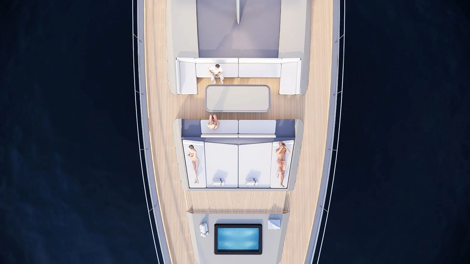 Provided art also shows a jacuzzi located scenically on the bow, as well as a plethora of lounging areas scattered across the sundeck. In addition its sail, the Boa Kingdom will be powered by twin 550-horsepower Volvo engines, good for a top speed of 15 knots (17 mph) and a cruising speed of 12 knots (14 mph).
