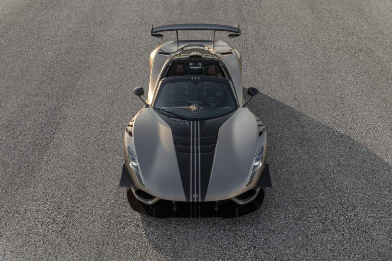 The body design is based on the already exclusive “Stealth Series,” which is covered entirely in exposed carbon fiber that Florey had tinted Cocoa and painted River Sand Metallic to create the “color of rich champagne.” It also previews bodywork elements from the forthcoming Venom F5 Evolution, including a new front splitter, reshaped dive planes, re-sculpted fender louvres, a new rear deck with integrated lip spoiler, and a significantly taller rear wing. Indeed, this is the most expensive Hennessey vehicle to date, which is why the elite American automaker chose to unveil it at Monterey Car Week’s prestigious The Quail, a Motorsports Gathering.