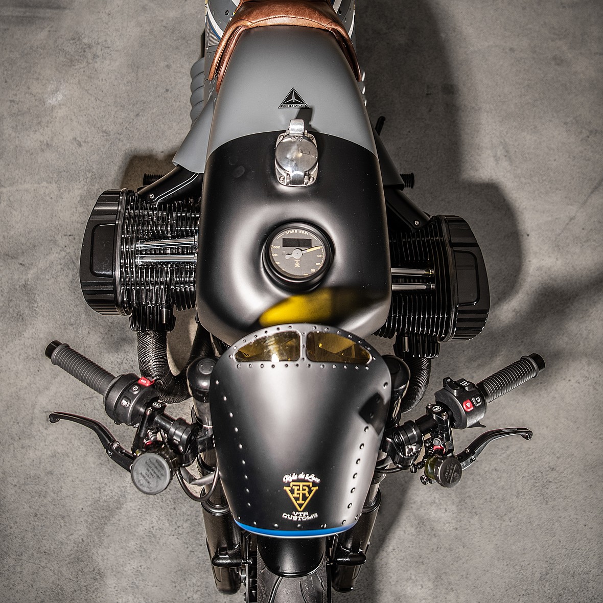 “One of the big challenges…was the replica cooling fins in the area of the rear silencers. Shaping these parts into parallel and beautiful radii and at the same time still fastening them harmoniously took a number of attempts,” Dainel Weidmann, owner of VTR Motorrad & VTR Customs, said of the aluminum sheet metal work.