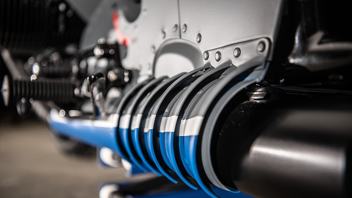 Starting with an R18 First Edition, Swiss BMW partner VTR Motorrad AG & VTR Customs painted the chrome, fork stanchions and massive 1,802cc Big Boxer two-cylinder black. WWII aircraft-style aluminum planking covers the frame, internals and gas tank while also forming an airplane fine-like tail. The final color scheme is true to the D-AQUI’s gray and black hues, save for the BMW tri-colored exhaust.