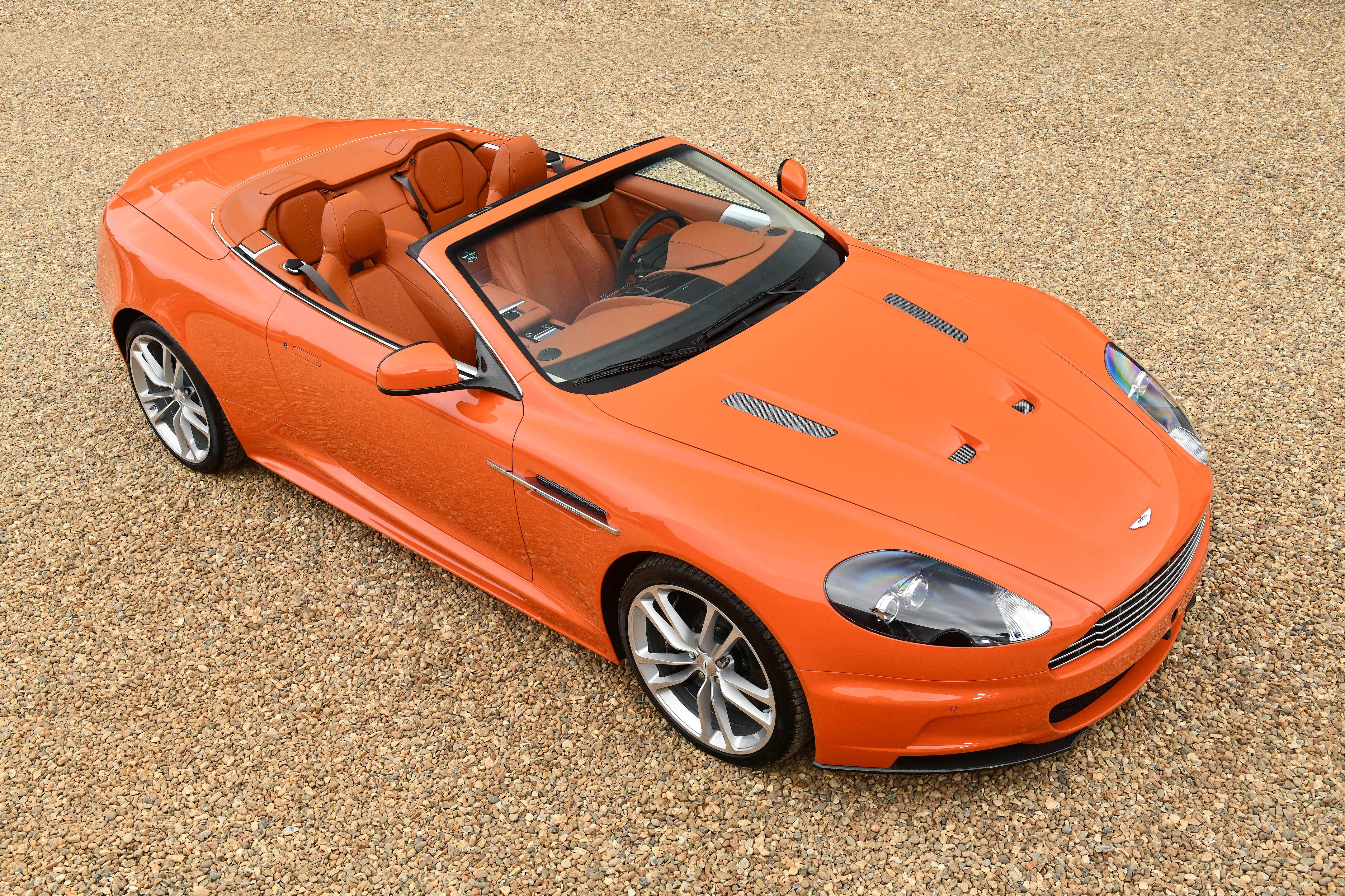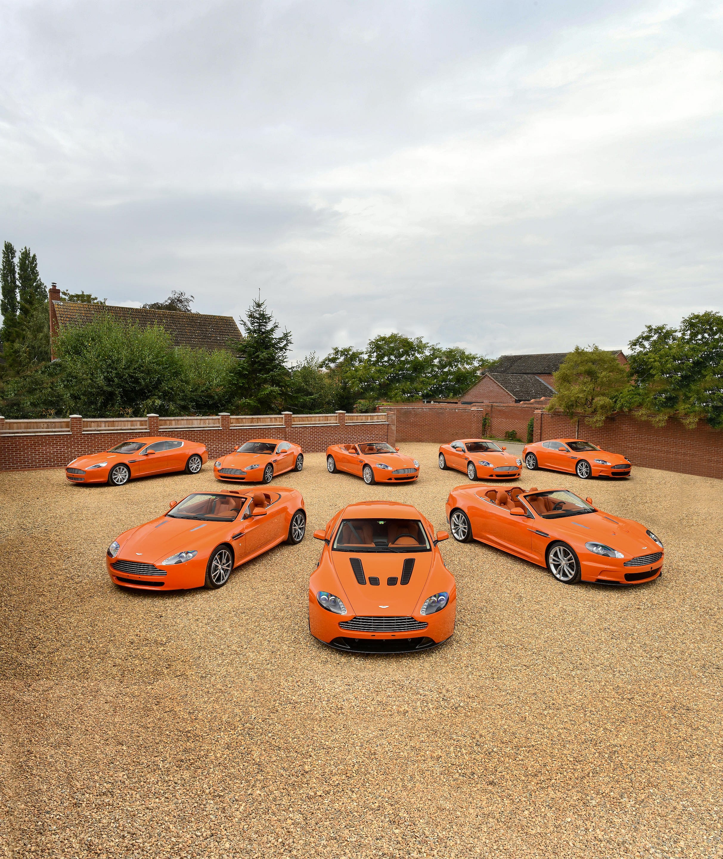 The colors perhaps most associated with Aston Martin are silver, thanks to James Bond’s DB5, and Racing Green, the hue that dresses the marque’s Formula One team. But “The Orange Collection” of Astons just might singlehandedly forge a new connection between color and marque in the brain of any bystanders.