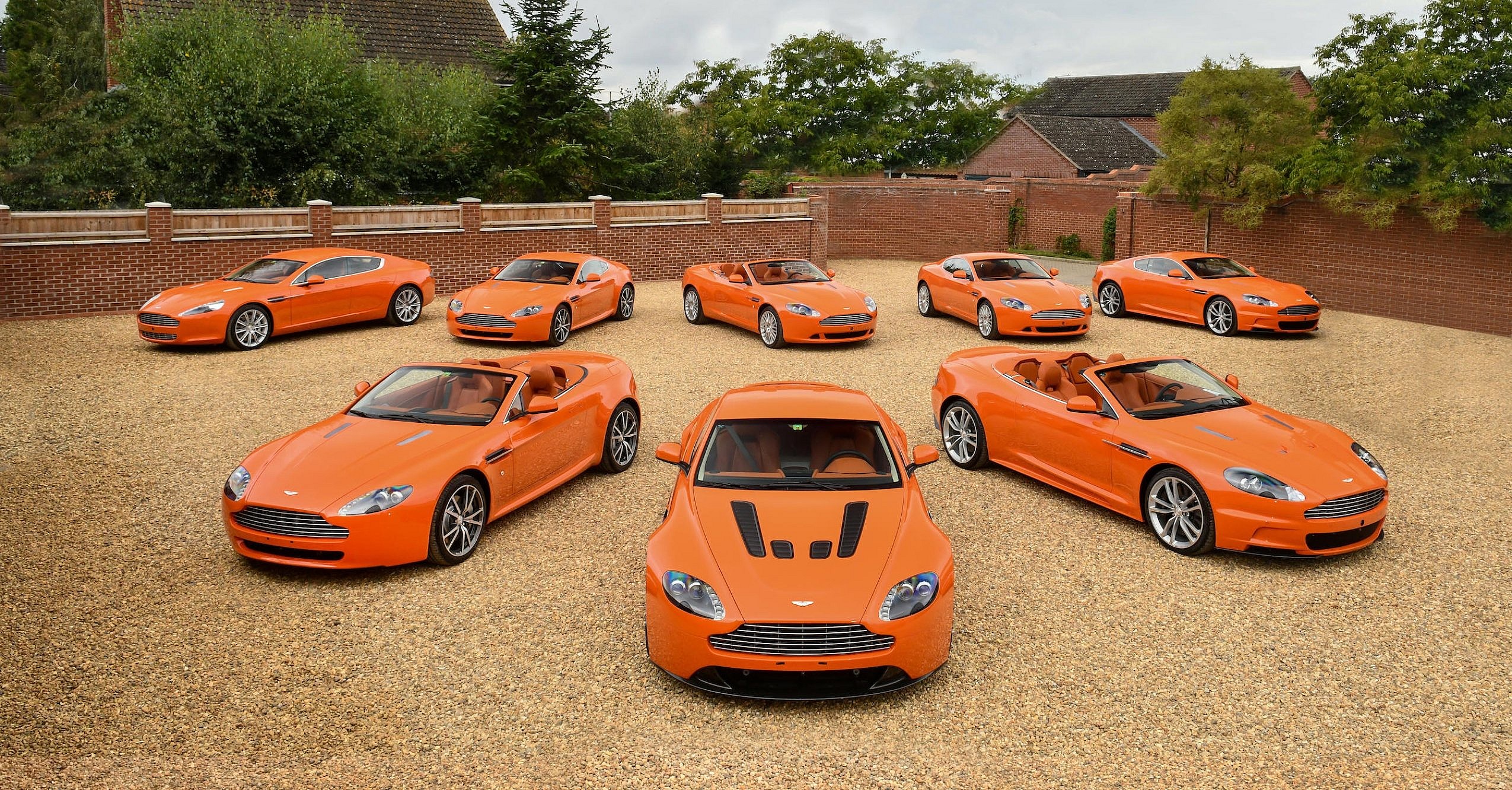 The colors perhaps most associated with Aston Martin are silver, thanks to James Bond’s DB5, and Racing Green, the hue that dresses the marque’s Formula One team. But “The Orange Collection” of Astons just might singlehandedly forge a new connection between color and marque in the brain of any bystanders.