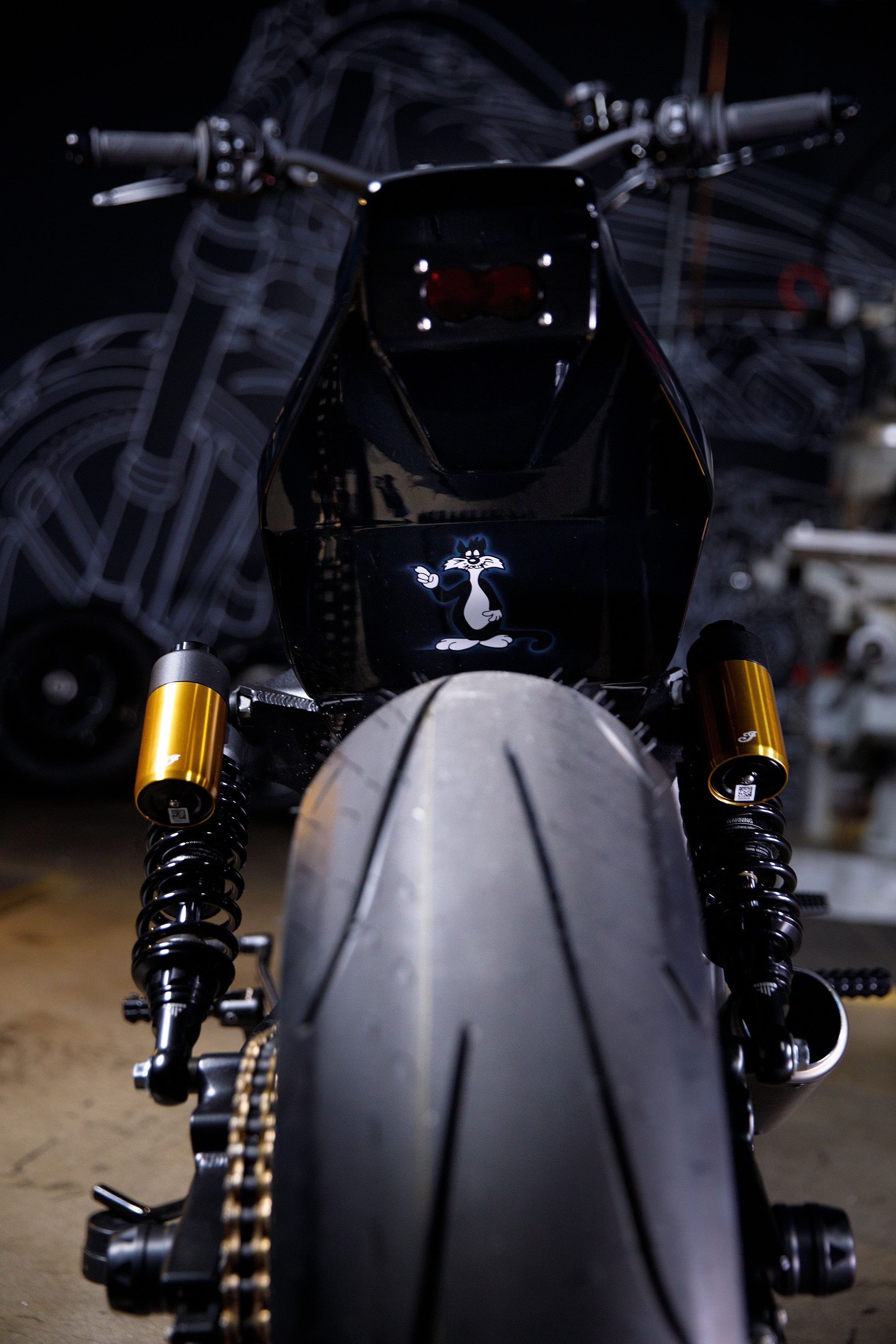 Sands and RSD fabricator Aaron Boss go on to explain that the design was largely inspired by dominant old-school Indian racer Ed Kretz. As a tribute, they emblazoned Sylvester the Cat on the tail’s underside—according to Sands, Kretz printed the cartoon on his business card with the quote, “Take your silly-ass problems down the street.”