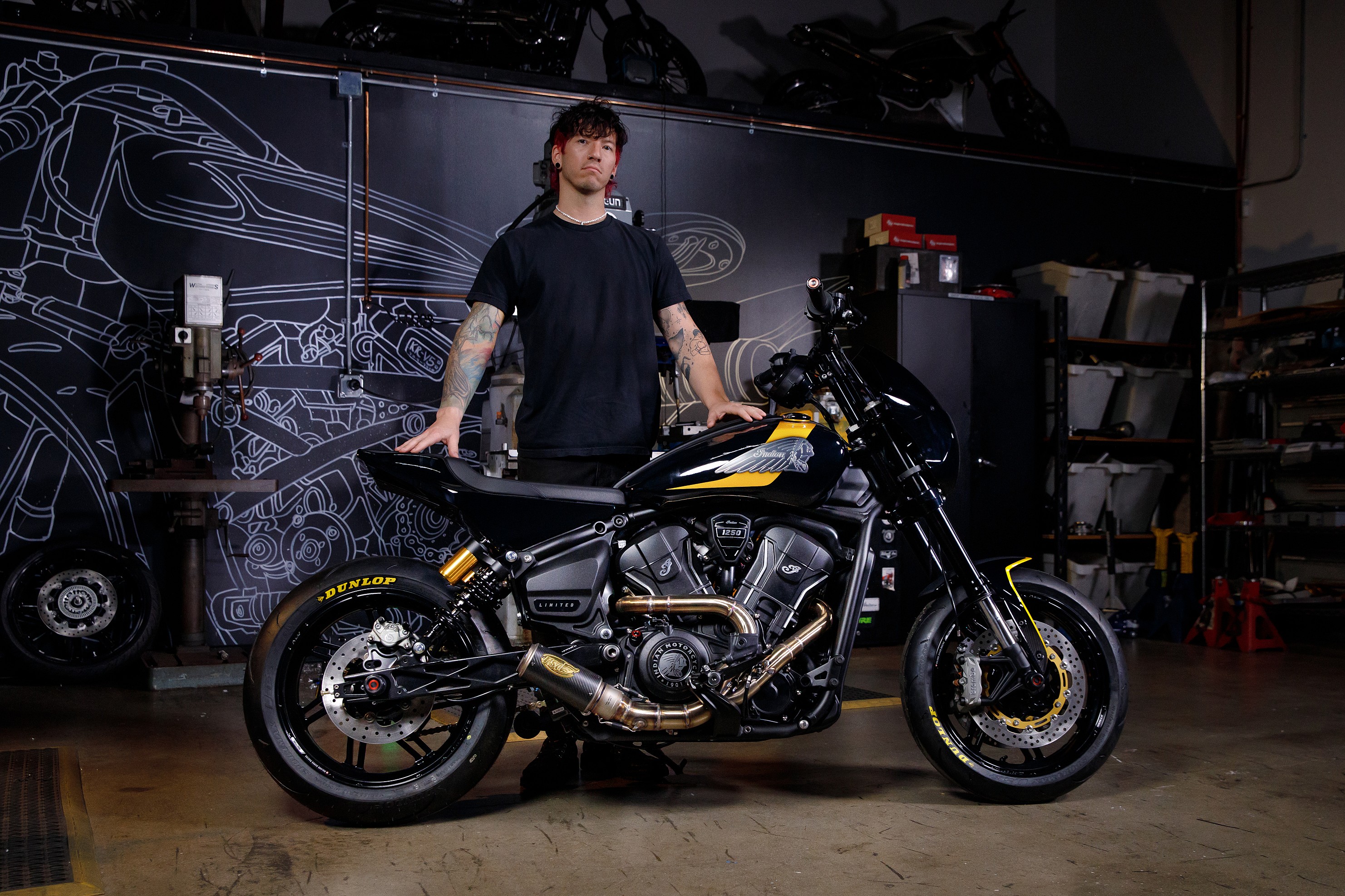 “We’ve always taken cruisers and turned them into sport bikes, more or less,” Sands says in the reveal video. Accordingly, Dun’s bike is a mashup of the Scout and the FTR: the 17-inch forged wheel wrapped in Dunlop Q5 rubber, the fork’s triple-clamped neck, and swingarm were all also used on the aforementioned Indian x RSD Super Hooligan. Dun’s bike also has front and back dual-disc brakes, a custom flat track-style tail, and a custom Saddlemen seat.