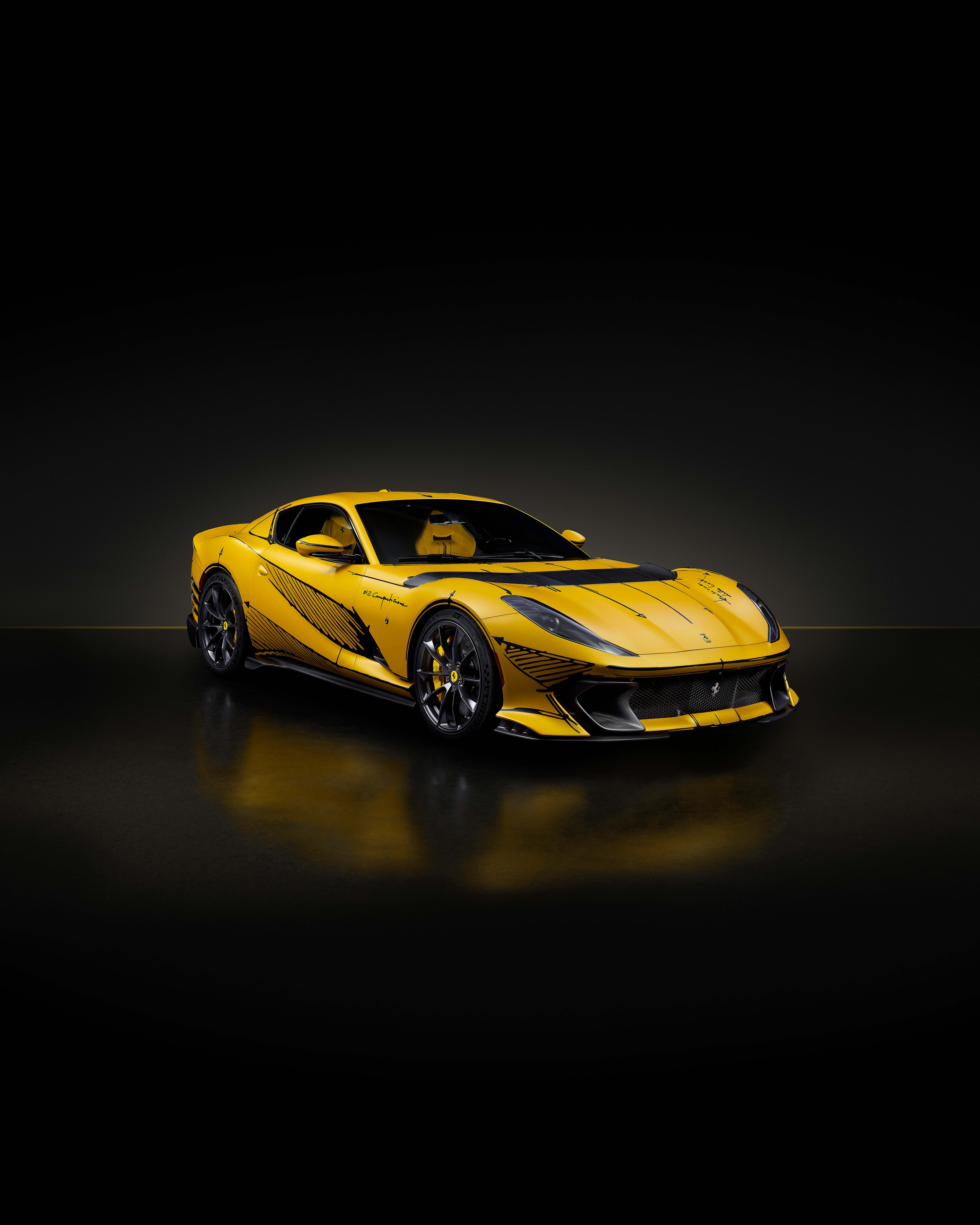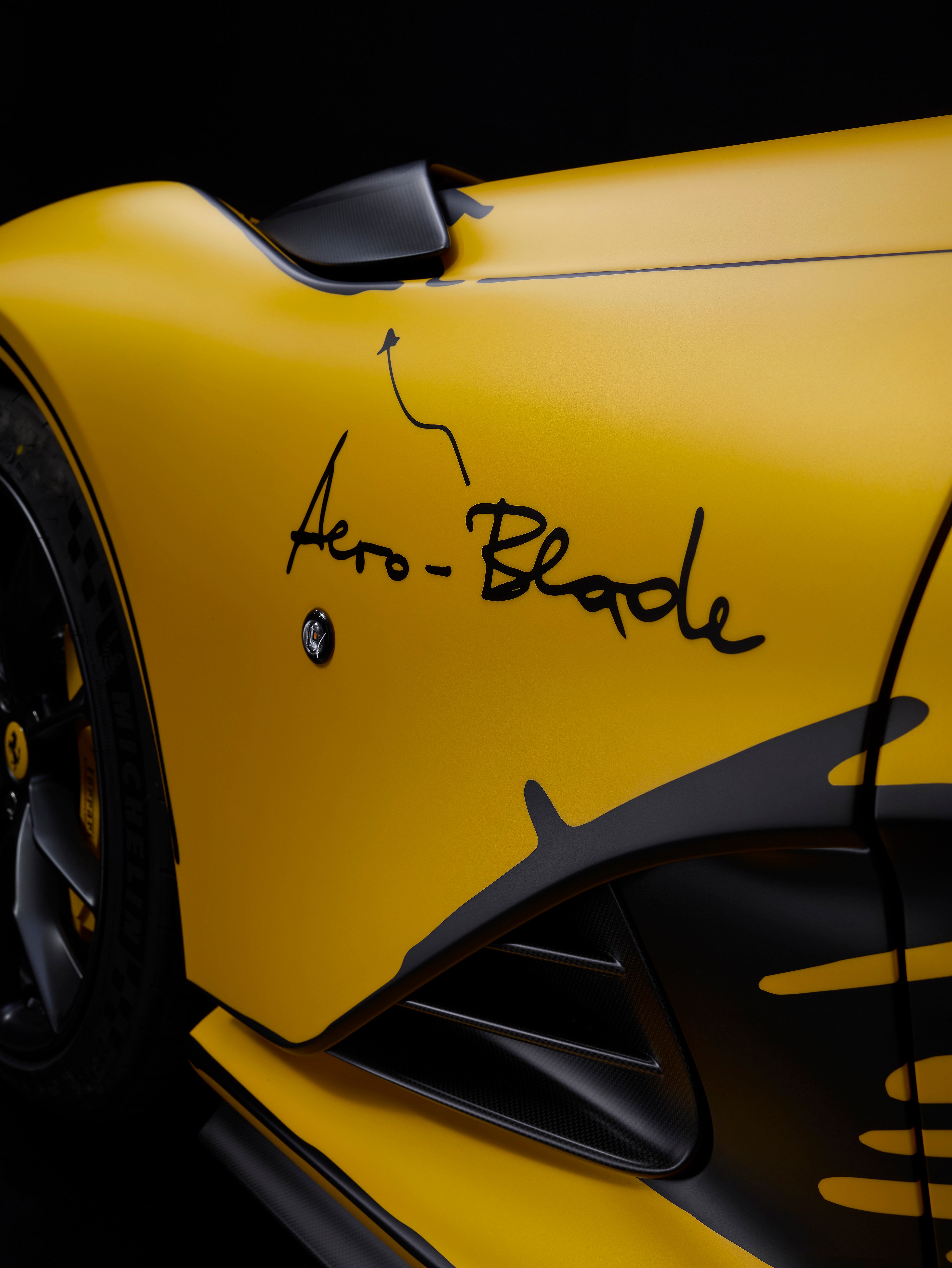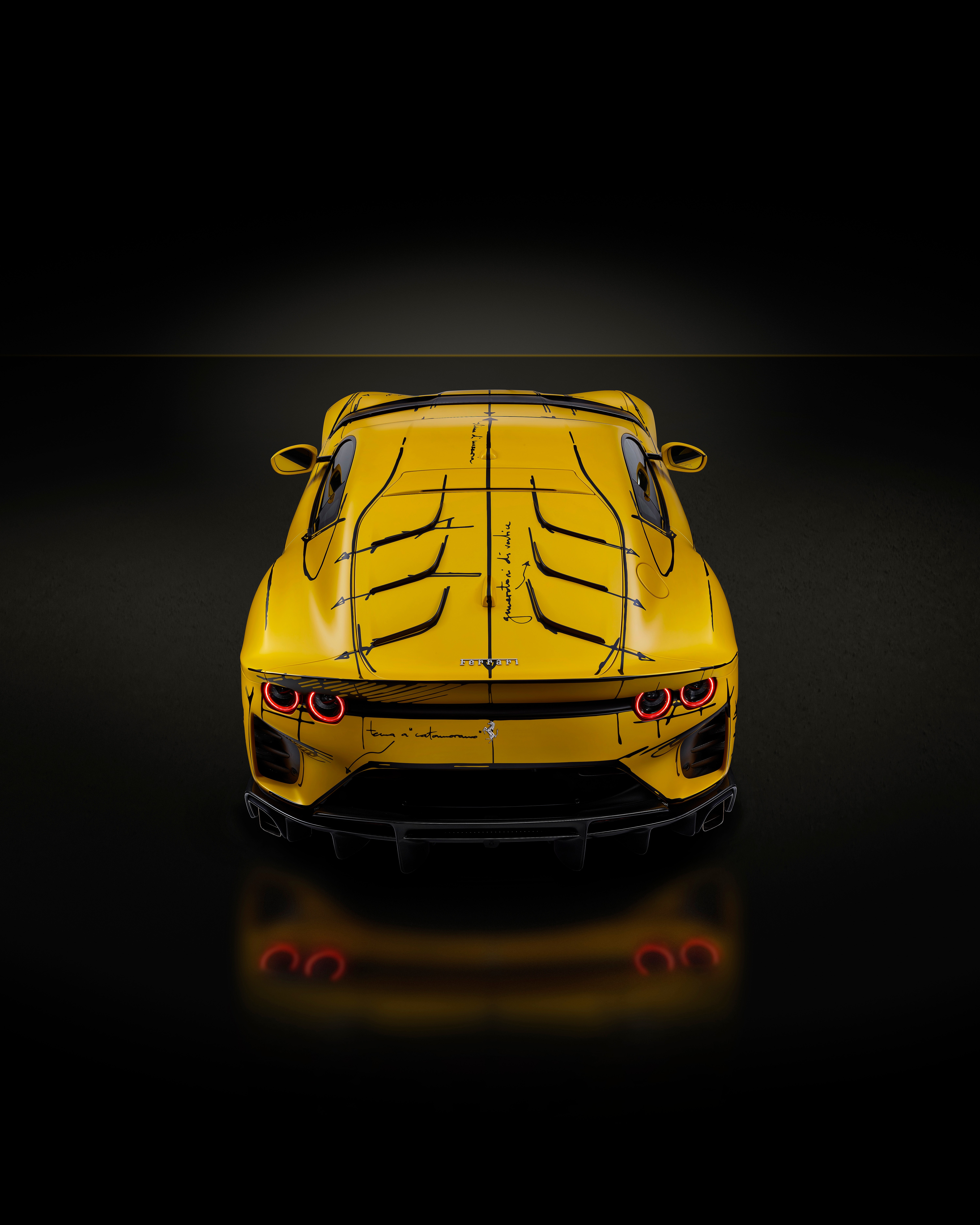 Drawing inspiration from the yellow cards on which Ferrari Chief Design Officer Flavio Manzoni and his team sketch nascent lines and ideas, the car was rendered in matte “Giallo Tristrato” yellow. That base color served as a literal canvas for the hand-tracing of key components in a black “Nero DS Sketch” hue.
