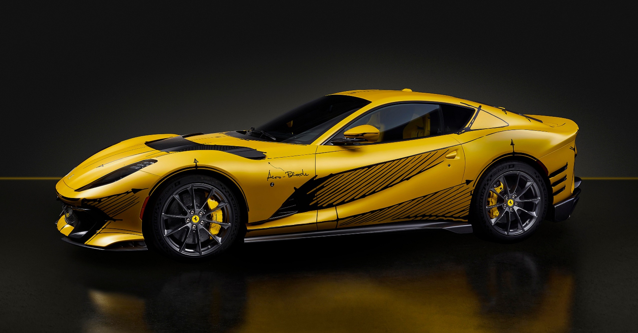 Drawing inspiration from the yellow cards on which Ferrari Chief Design Officer Flavio Manzoni and his team sketch nascent lines and ideas, the car was rendered in matte “Giallo Tristrato” yellow. That base color served as a literal canvas for the hand-tracing of key components in a black “Nero DS Sketch” hue.
