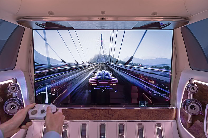 The space also incorporates a video game console, a retractable 65-inch cinema screen with split-screen functionality that rises from within the floor, a surround-sound system and seven integrated projectors—it’s essentially a mobile entertainment room that’s begging to go on cross-county road trips. The side windows can also function as additional projection surfaces, creating a 360-degree digital experience. The switchable glass technology extends to the partition, floor slats, and windowpanes, offering customizable privacy and sun protection.