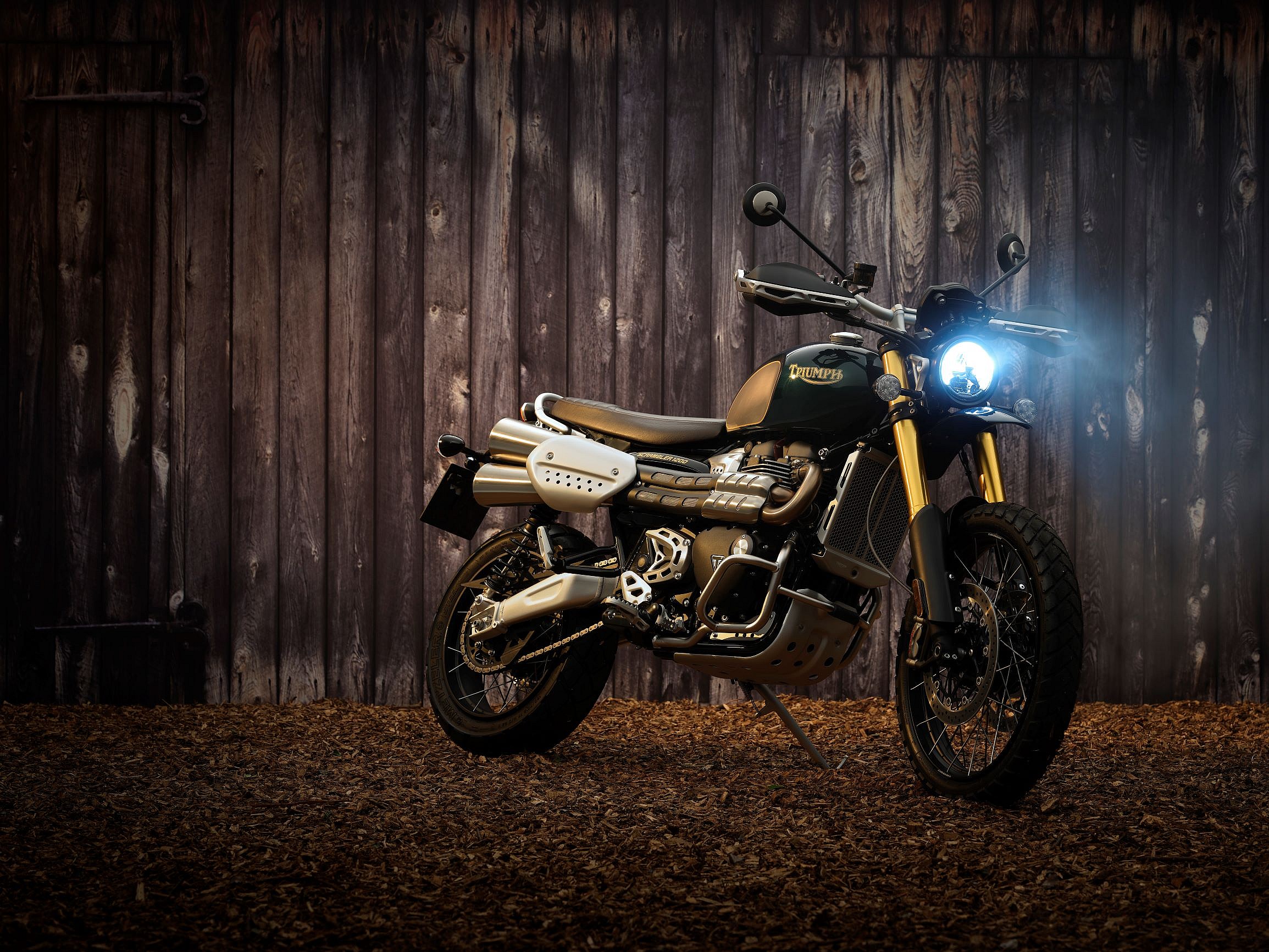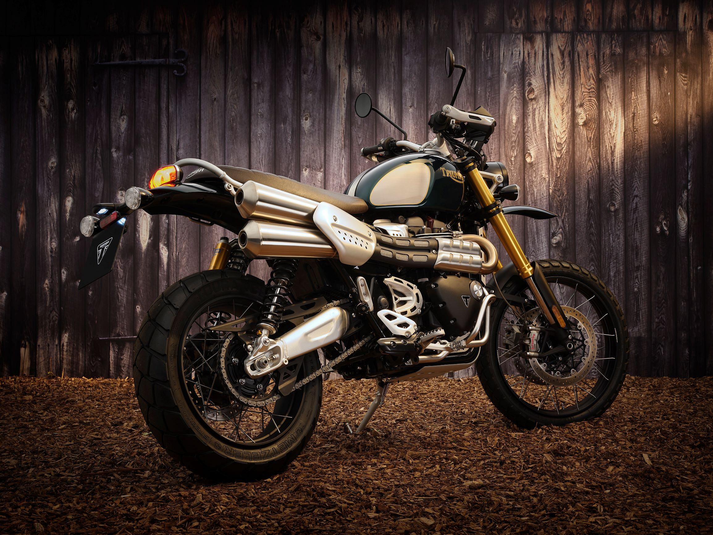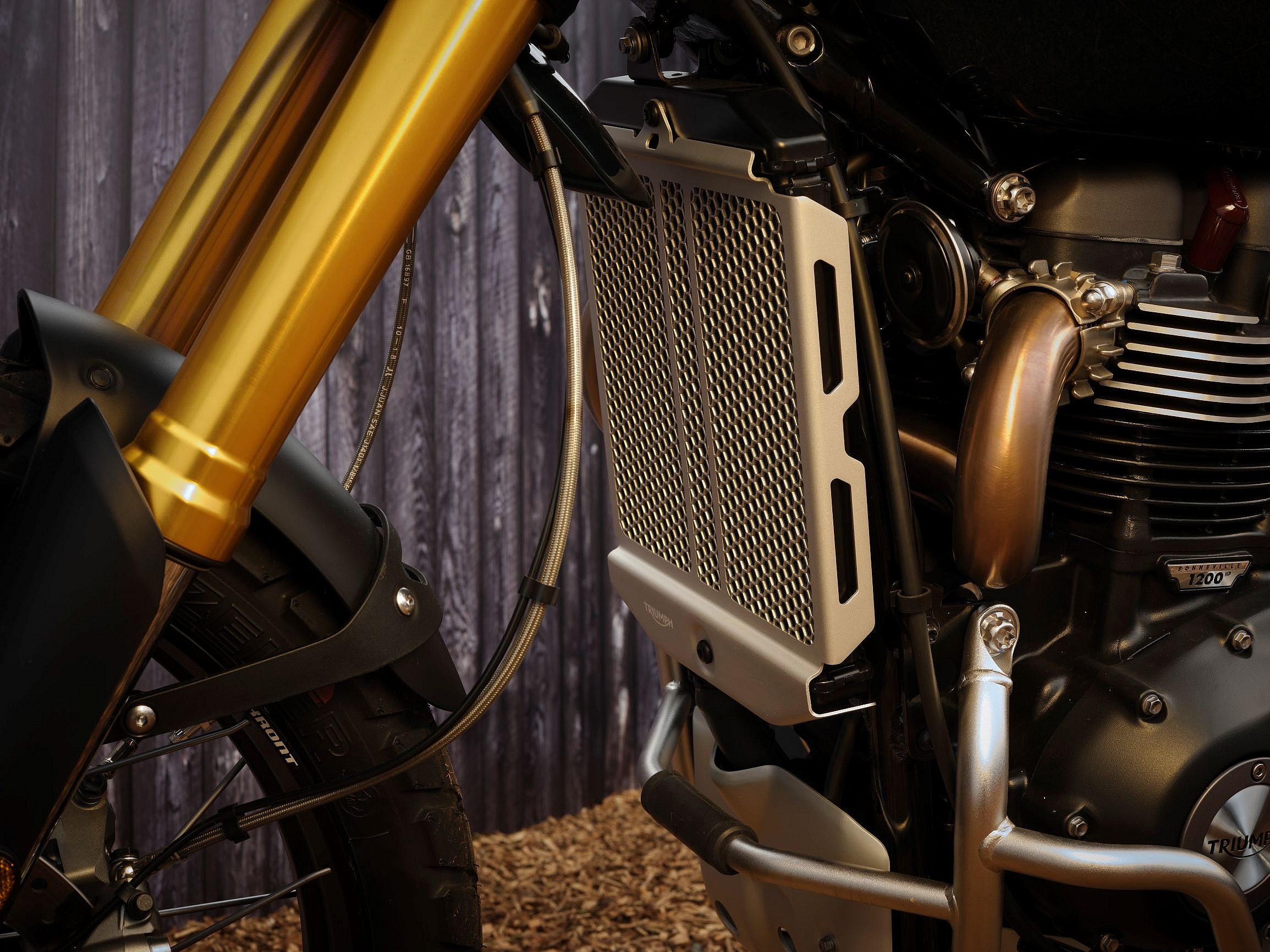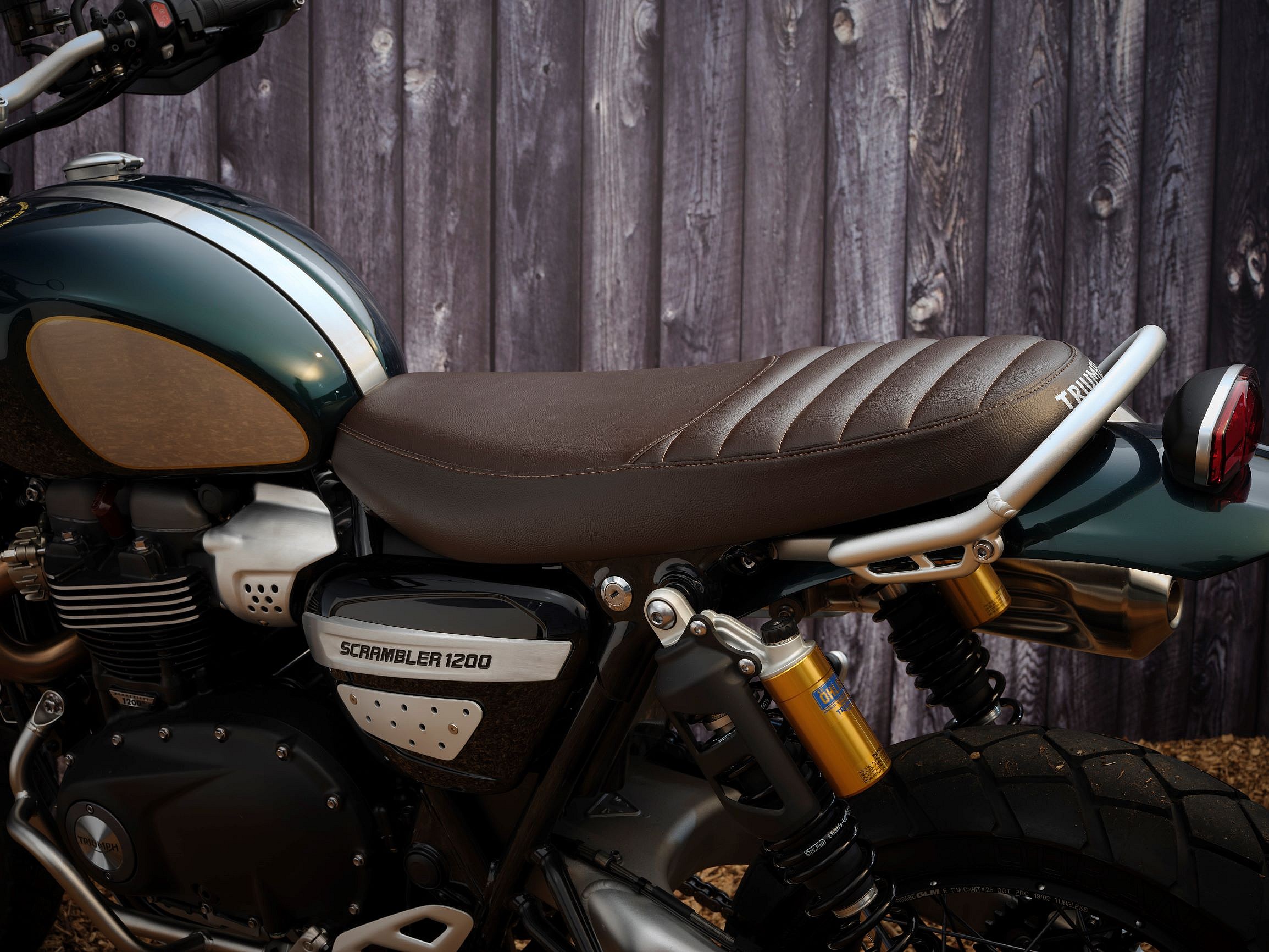 A laser-cut and pressed aluminum radiator guard offers further protection from off-road elements. The premium brown bench seat with stitched ribbing rounds out what Triumph says is the highest-spec factory Scrambler 1200 ever.