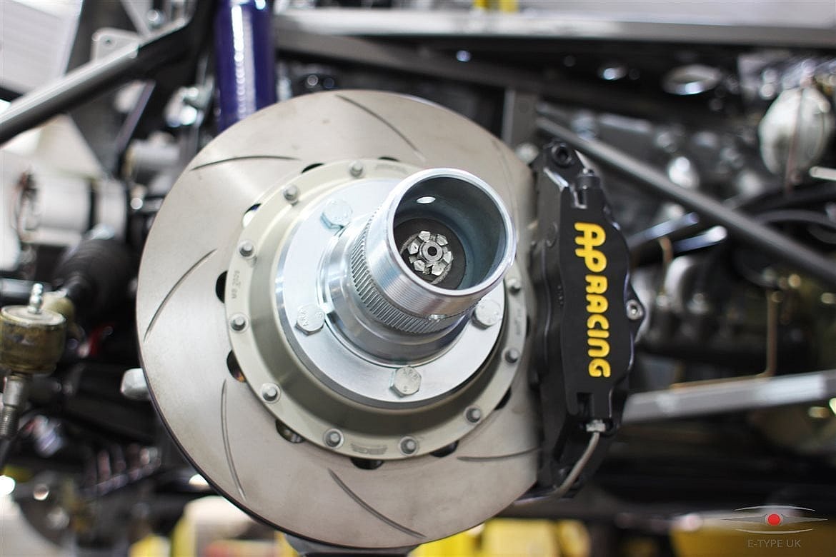 The “highest-spec” E-Type features adjustable sports suspension mounted with stiffer polyurethane bushings and four-piston AP Racing brake calipers with vented and grooved discs.