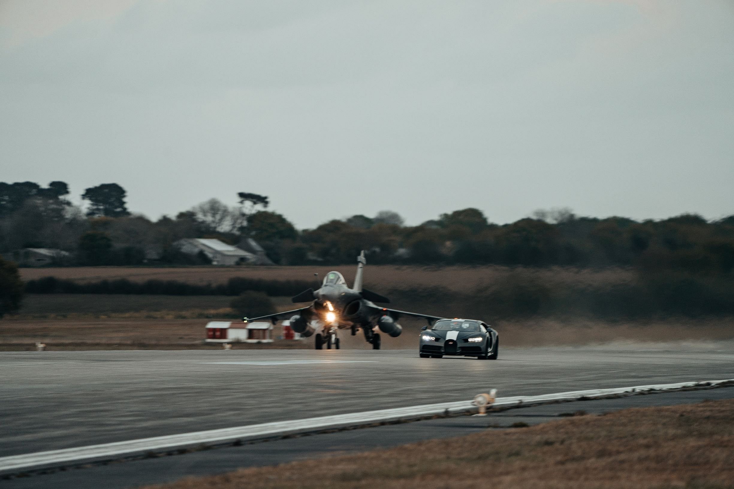 With Bugatti’s Le Mans and French Formula 3-winning test driver Pierre-Henri Raphanel at the wheel, the Chiron took the lead early lead on the go ground, but the altitude-gaining fighter jet was well ahead by the time Raphanel hit the brakes before running out of runway.