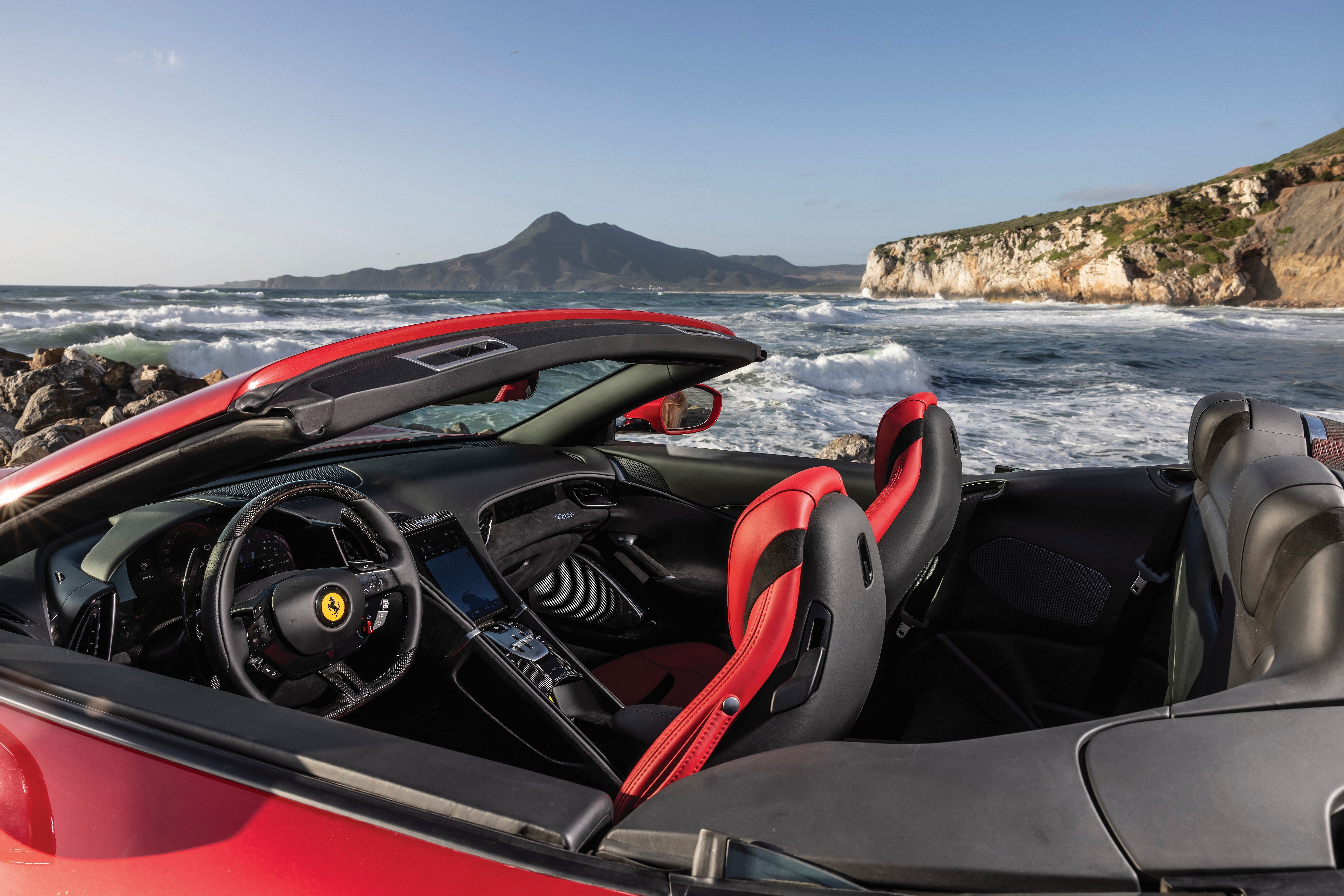 And push the throttle you will, with endless glee. Thanks to a new gearing developed for the Roma coupe, the Spider offers near instantaneous throttle response, with 80% of torque available at just 1,900 rpm—and max 561 lb-ft (760 Nm) unleashed at only 3,000 rpm. Surfing the sinewy coastline that demands constant braking, the ability to burst out of corners with breakneck pulls exhilarates. The official 0-60 mph click of 3.2 seconds seems modest, while Ferrari’s famed steering remains wonderfully tight, responsive to every slight whim without acting jumpy like a supercar.