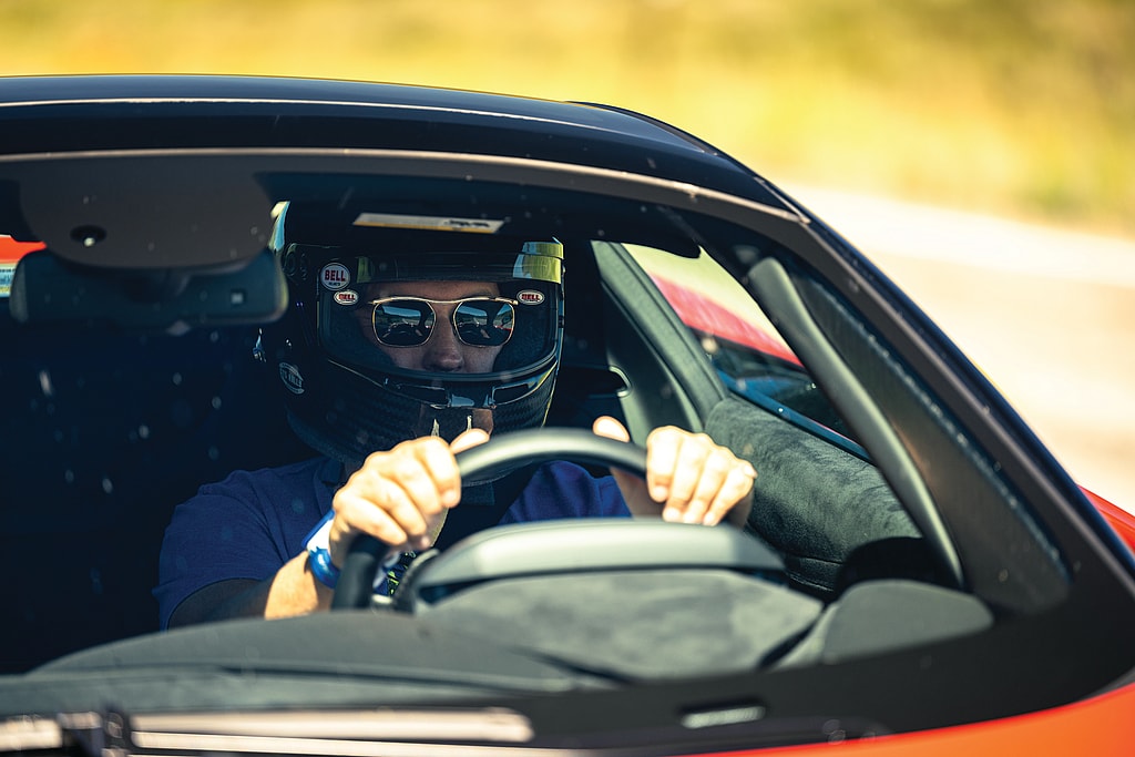 Right foot flat on the gas. 1st, 2nd, 3rd, 4th, around the sweeping uphill blind left-hander, 5th, 6th, into 7th. One hundred percent focused on the road but feeling a loss of acceleration…sensitive and adjusting to stay smooth…across the line and past the slow-down flags into the pits. Breathe. A shade under 200 mph. Someone tells me 7th is overdrive and she goes faster in 6th.