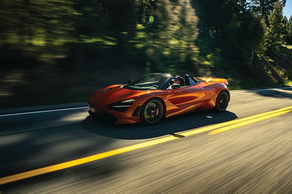 Strapped into an Ember Orange 710-hp McLaren 720S Spider with a demented grin. Earpiece poking me in case of streakers, bison, pterodactyls, or debris from a spaceship crashing to Earth on the sub-optimal two-lane tarmac and weeds of Route 75. The camber enough to slide off if the Pirelli P-Zeros give up and take a break.