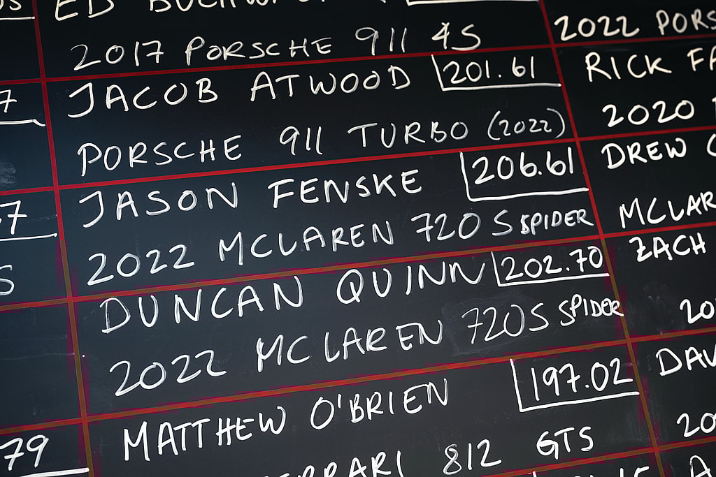 Damn. Head out again. No radio problem. In auto now and it feels odd. I’m told it’s the move, so go with it. Headwinds up. A wave of flag… bury it. 1st, 2nd, 3rd, 4th up around the blind sweeping left, 5th, 6th… right foot hard and deep into the floor… flat out before the trap… then slow down flags…and pits…and finally, “200 MPH CLUB.” The McLaren leaving lesser marques eating its dust.