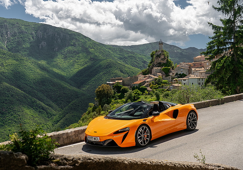 The Artura Spider’s hybrid powertrain is ideally suited for the type of driving we did on the glorious slice of the South of France. Lower speed, nearly silent cruising in EV mode was perfect for the famously labyrinth streets of the principality itself. And when we got up into the hills above it was time for a fiercer approach, accomplished with a flick of an F1-style switch. Then it was time to experience the sheer thrill of hitting 0-60 in 3 seconds; we would have needed a racetrack to rocket to the top speed of 205 mph, but McLaren doesn’t make cars that go slower than that, as we’ve had pleasure to confirm in the past.