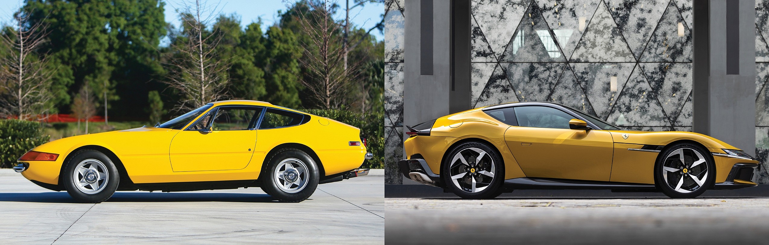 | Engine: 4.4-liter Tipo 251 Colombo V12 producing 352 hp Transmission: 5-speed manual + reverse Top Speed: 174 mph Years Produced: 1968–1973 | Engine: 6.5-liter F140 HD V12 producing 830 hp Transmission: 8-speed dual-clutch automatic Top Speed: 211-plus mph Year Produced: 2024–present |