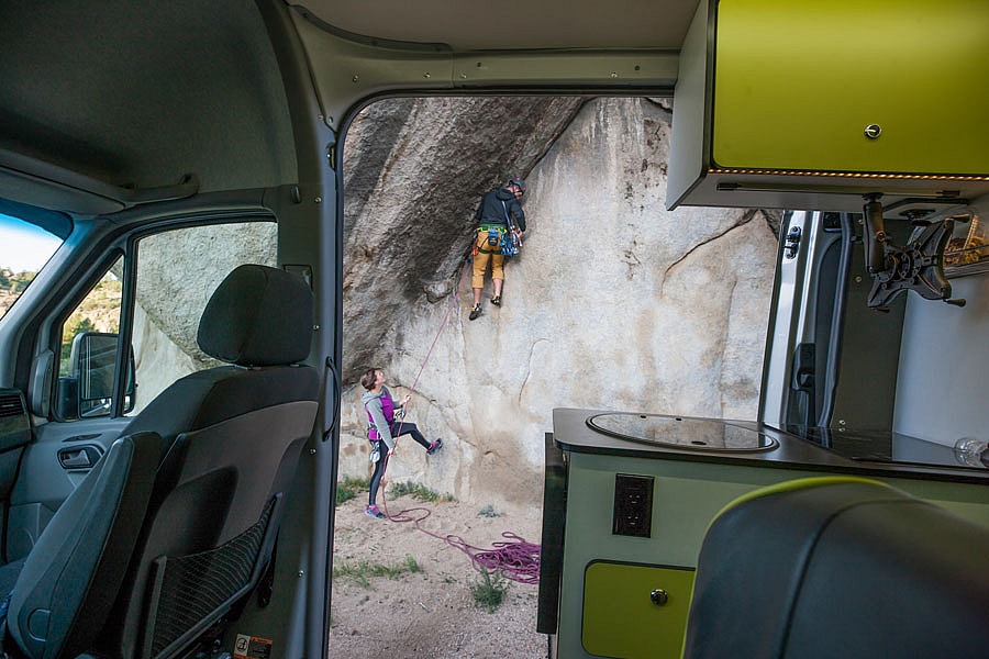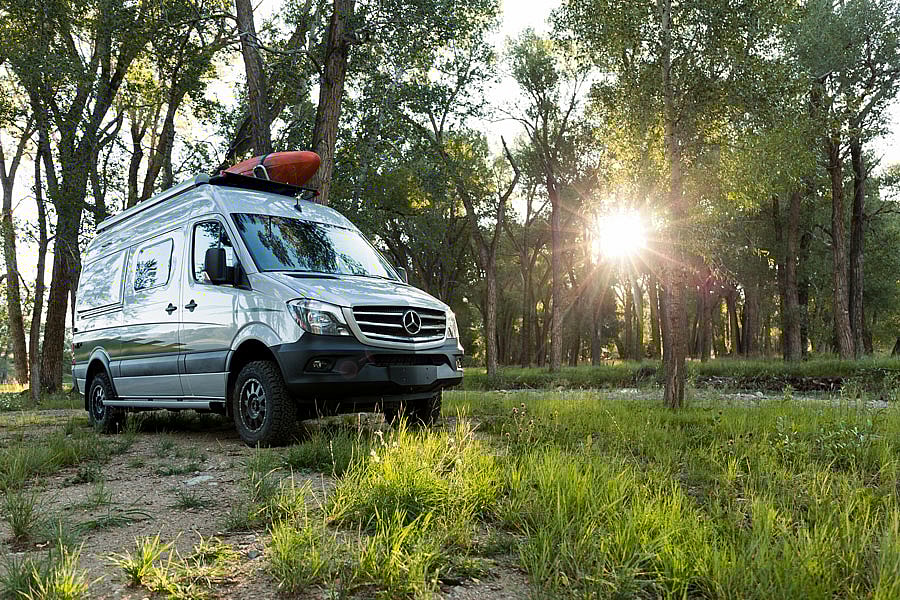 Here’s what you get: a Mercedes Sprinter 4×4 chassis with a 188 horsepower, 325 lb.-ft torque 3.0-liter inline six-cylinder turbodiesel. The four-wheel drive system features a torque-multiplying low range and the Sprinter includes a hill descent mode to help you get back down the mountain you’ve climbed using the low range and the knobby off-road tires.
