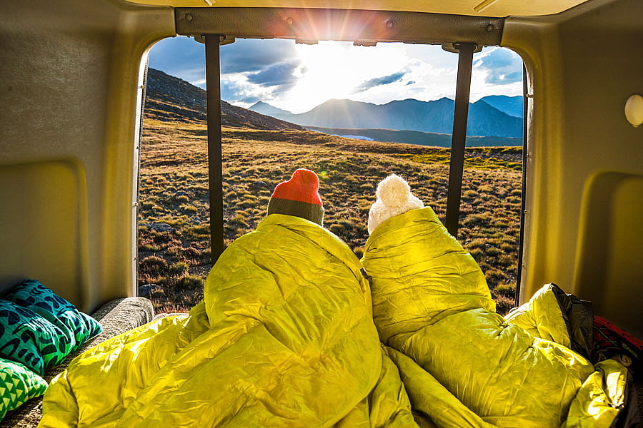 The bed is on a lift above the rear cargo area, so you can pack in bikes and other bulky items while you’re on the road and then lower the mattress to sleep at night.