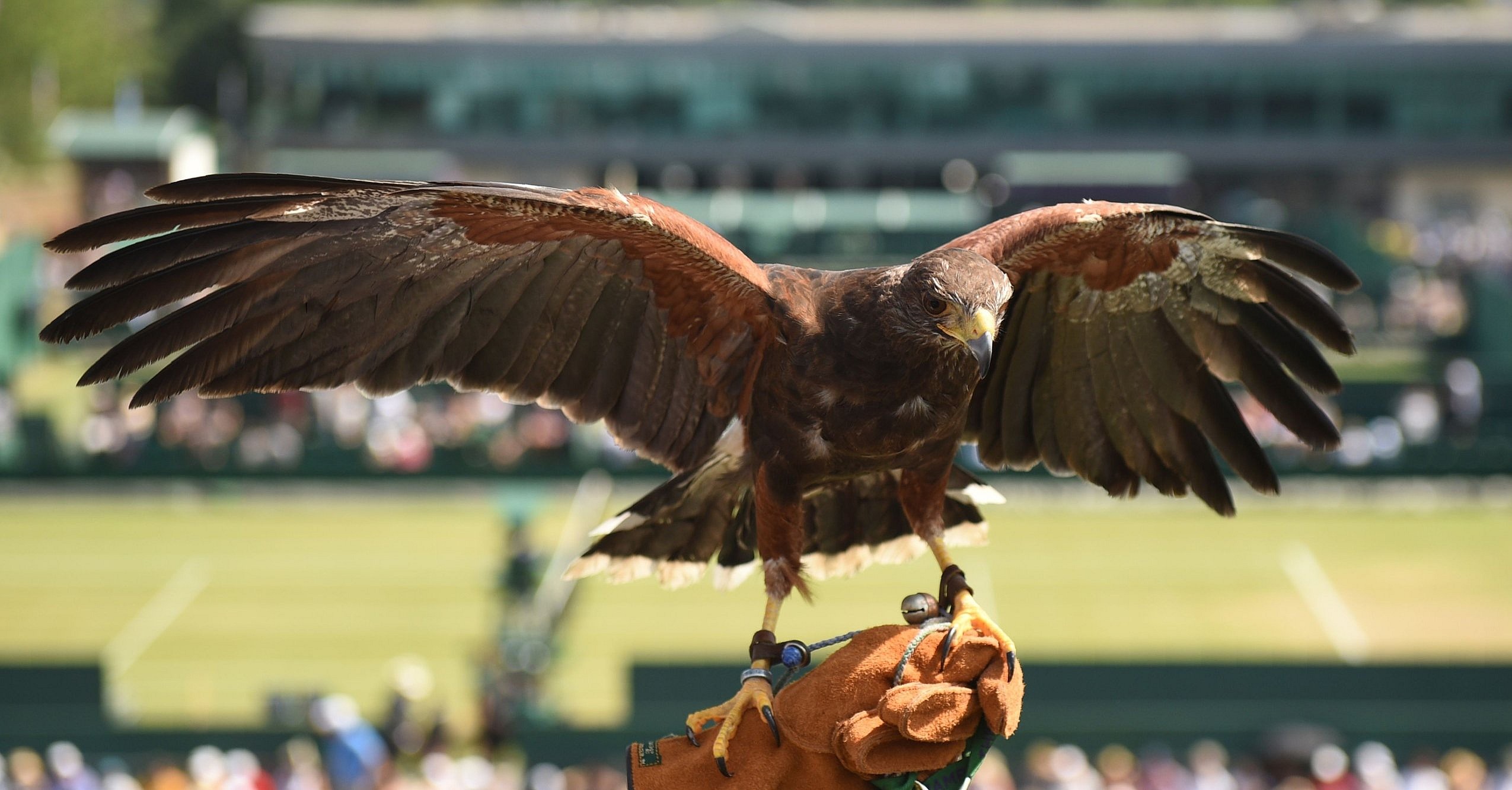 Pigeons are definitely unwelcome at Wimbledon. Organizers are so intent on keeping the sky and grounds clear of the cooing little pests that the tournament employs its own Harris Hawk named Rufus to scare them away. At 9 a.m. most mornings, Rufus is sent out to fly over the tournament grounds and keep the local pigeons in check. As an employee, Rufus even has his own All-England Club member ID card.