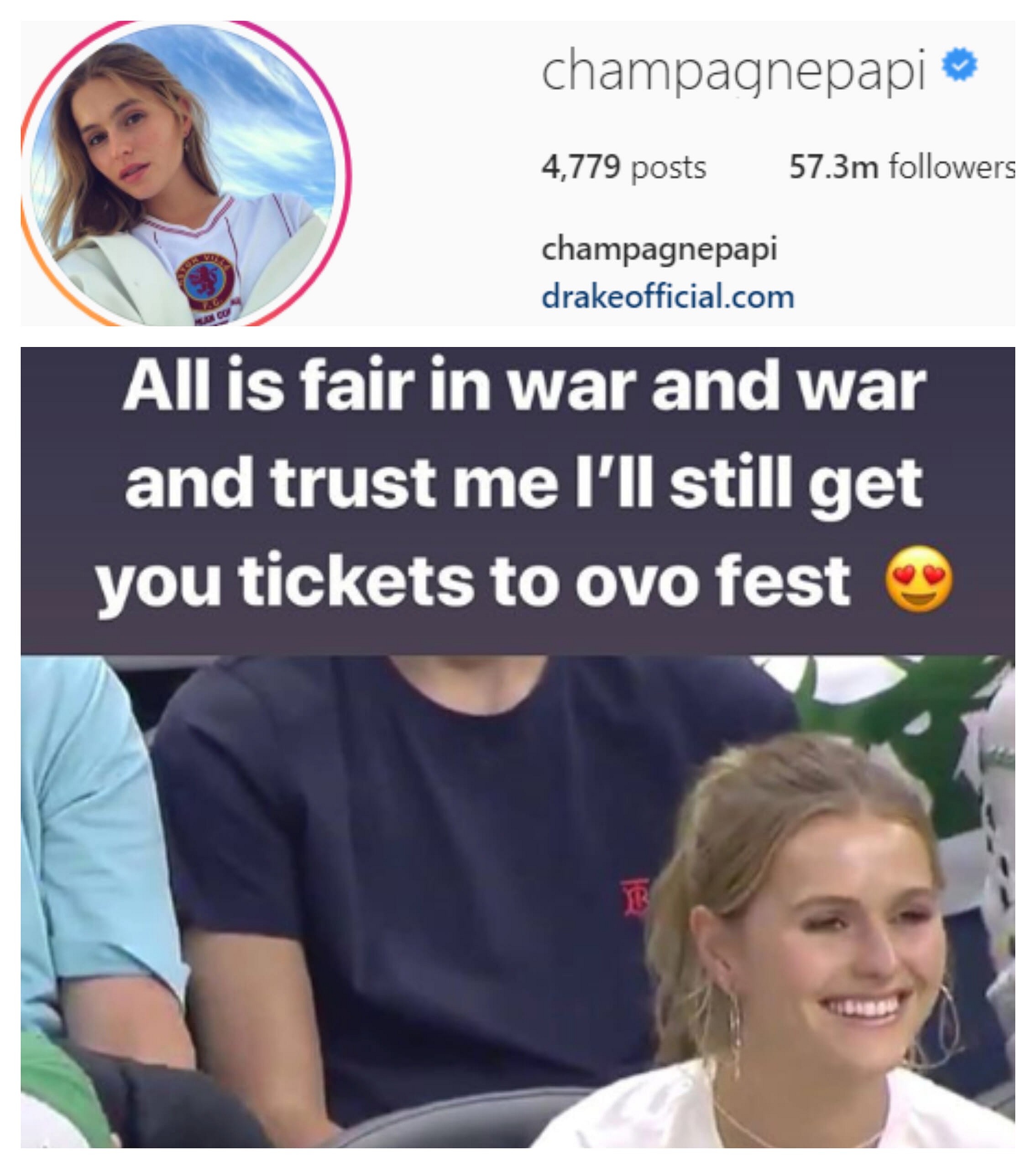 “All is fair in war and war and trust me I’ll still get you tickets to ovo fest,” Drake wrote.