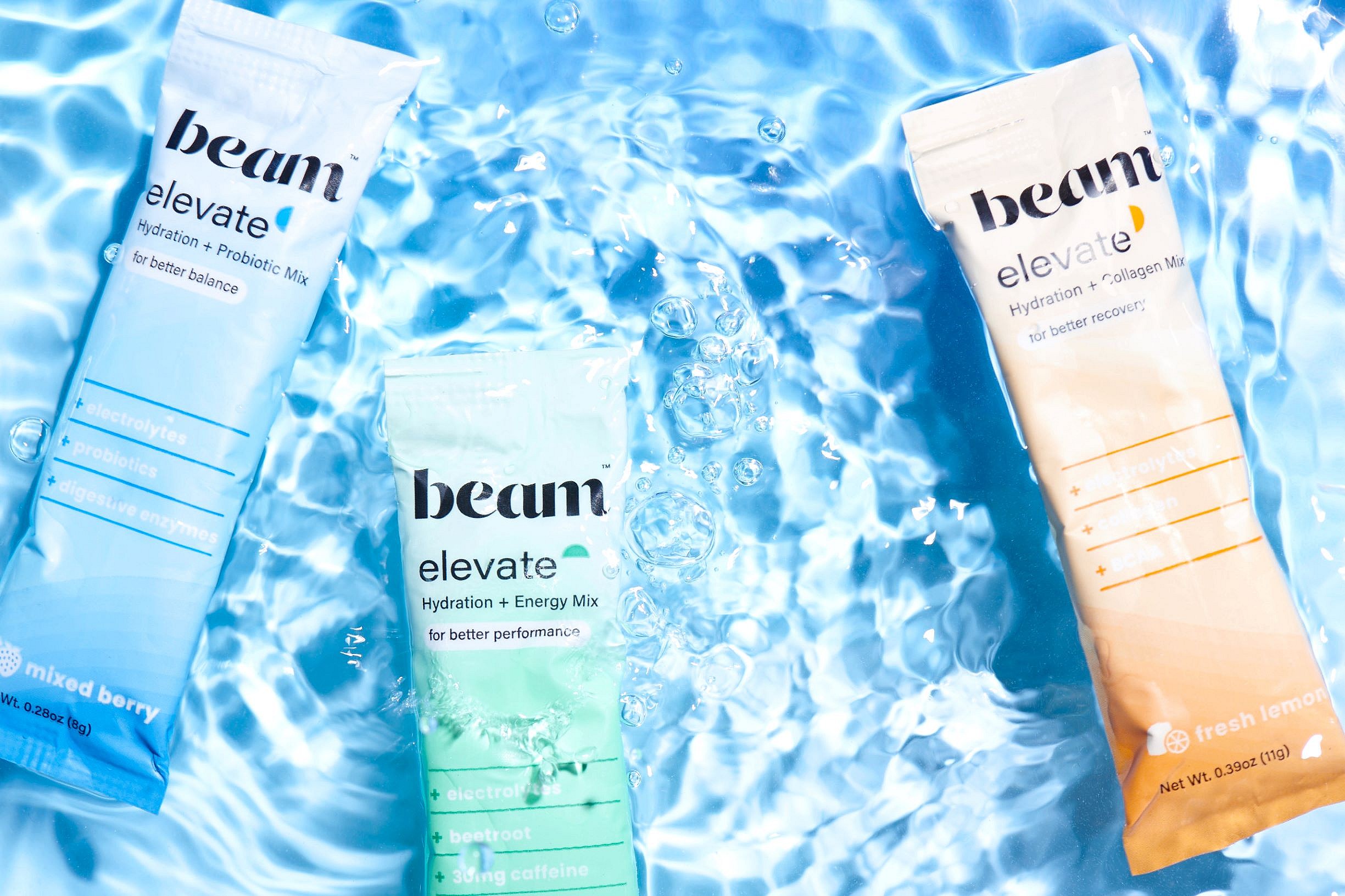 That said, beam’s new elevate line of hydrating products is extending you a helping hand to hydration. “The majority of Americans are dehydrated and don’t even know it,” explains beam co-founder Kevin Moran. “This dehydration leads to stress, fatigue, headaches, and all sorts of other serious issues. The majority of people wake up and deal with dehydration on a daily basis and don’t even realize it.”