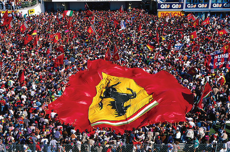 Lauda’s departure in 1978 left big shoes to fill, but Jody Scheckter stepped up. A more kinetic and instinctual driver, the South African’s aggressive style delivered Ferrari its third title of the decade in 1979. That championship would be Ferrari’s last for 21 years. The 1980s and ’90s delivered no world titles but still bequeathed thrilling moments—none more sweet than when checkered flags waved at Monza. Every year at the Italian Grand Prix, dedicated throngs of tifosi, as Ferrari racing fanatics are known, paint the Italian countryside a deep crimson as far as the eye can see, especially at the racetrack’s iconic podium, which transforms into a roiling blood-red sea whenever Ferrari claims the top spot. Arguably, the most symbolically charged being the 1988 Grand Prix.