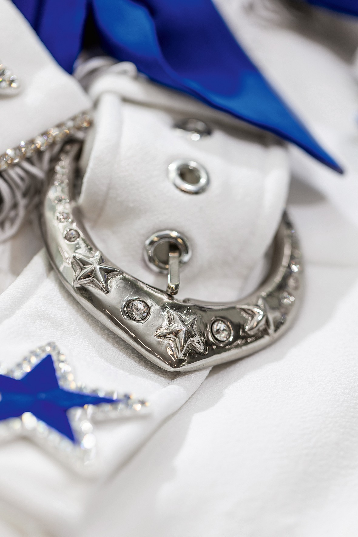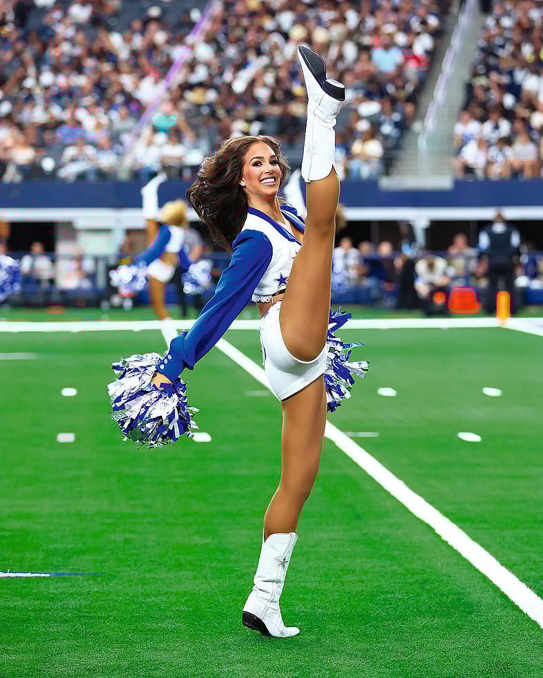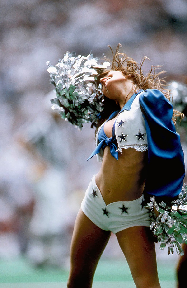 While that original squad was coed, by 1970, the Dallas Cowboys were a championship-caliber team that would soon win its first NFL title at Super Bowl VI in 1971. Simultaneously, the DCC began to take the shape that we recognize today. Together with choreographer Texie Waterman, Schramm and Brock initiated a transition away from the collegiate style of cheers, chants, and tumbles in favor of more mature moves featuring jazz-inspired high kicks and pirouettes that’d be equally at home on the sidelines and a Broadway stage. Fashion designer Paula Van Wagoner was also brought aboard during these formative years to create an alluring outfit that facilitated athletic movement. The Western-style ensemble—a blue and white bolero jacket emblazoned with Dallas stars, white shorts and matching cowboy boots—remains as the DCC’s official attire to this day.
