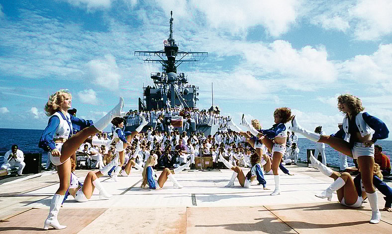 With that blink of an eye, a DCC supernova was triggered, as members of the squad began appearing on talk and variety shows. A made-for-TV movie, Dallas Cowboys Cheerleaders, took top ratings and even spawned a sequel. A 1977 pin-up-style poster—which has since been inducted alongside a vintage uniform into the Smithsonian Institution in Washington, D.C.—sold 1 million copies. Most notably during this era, the DCC kicked off its proudest tradition with an inaugural USO tour in 1979. Over the next four decades-plus, the DCC entertained American military personnel on nearly 90 USO tours in over 40 countries, more than any other single entertainer.