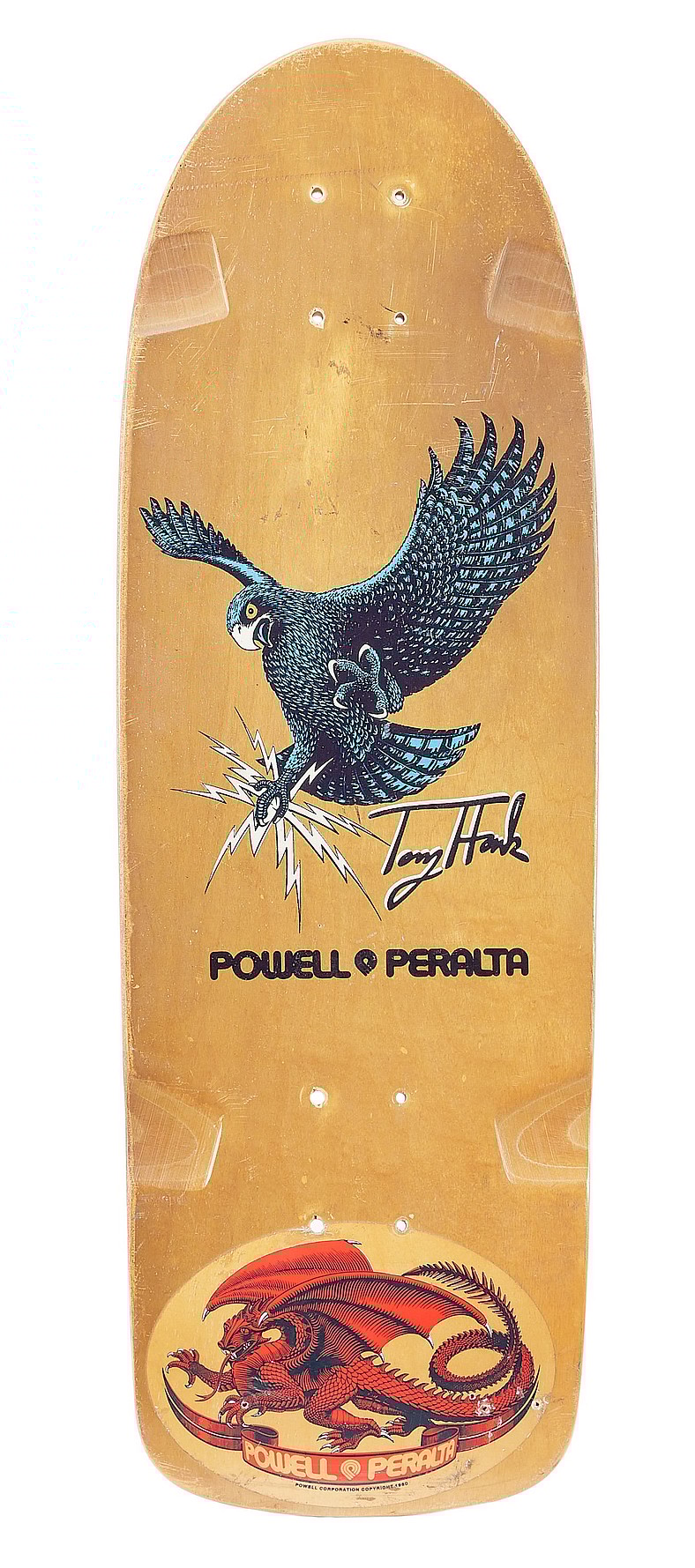 Meanwhile, two of Hawk’s 1982 Powell-Peralta decks—his first pro models—will also hit the block. The earlier deck is valued at $7,000 to $9,000, but another rare, wood-stained iteration could go for $40,000 to $60,000 thanks to a one-of-a-kind smoky patina it acquired in a house fire. And that was only the first time the board narrowly survived a freak accident, as it was later unceremoniously tossed into the street by staff of a shuttered Quiksliver store that had borrowed the board from Hawk. Fortunately, an eagle-eyed aficionado rescued the artifact and put it up for sale, at which point Hawk’s neighbor spotted the deck and connected him with its unwitting buyer so he could buy it back.