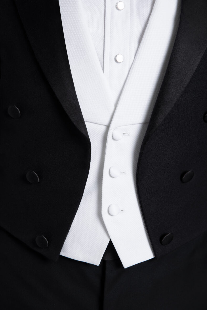 “A tuxedo should never use the same cloth as a basic black suit, so you want to look for barathea weaves or blends with mohair for more structure, drape, and reduced wrinkling. Fabrics with mohair are great for tuxedos, they give a bit of a sheen but really hold the crease very well. But no more than 20% mohair, otherwise it’s too shiny.”