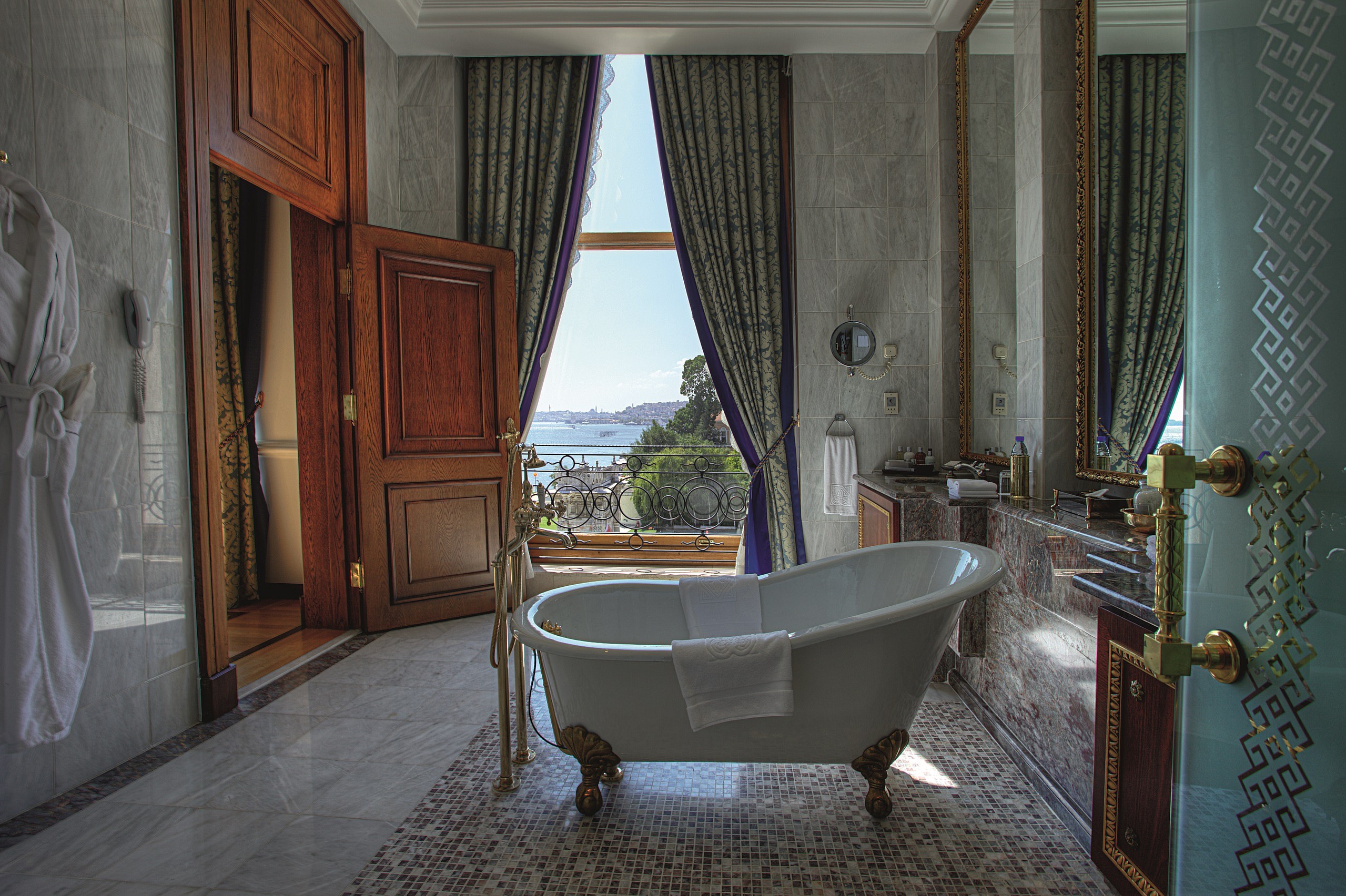 The name is no overstatement — Çırağan Palace Kempinski is literally an Ottoman Palace and the Sultan Suite is not just fit for royalty, it’s also one of the largest hotel suites in all of Europe. The bathroom has sweeping views of the Bosphorus strait, an oversized tub, shower, jacuzzi, and soaring ceilings that add to the grandeur.
