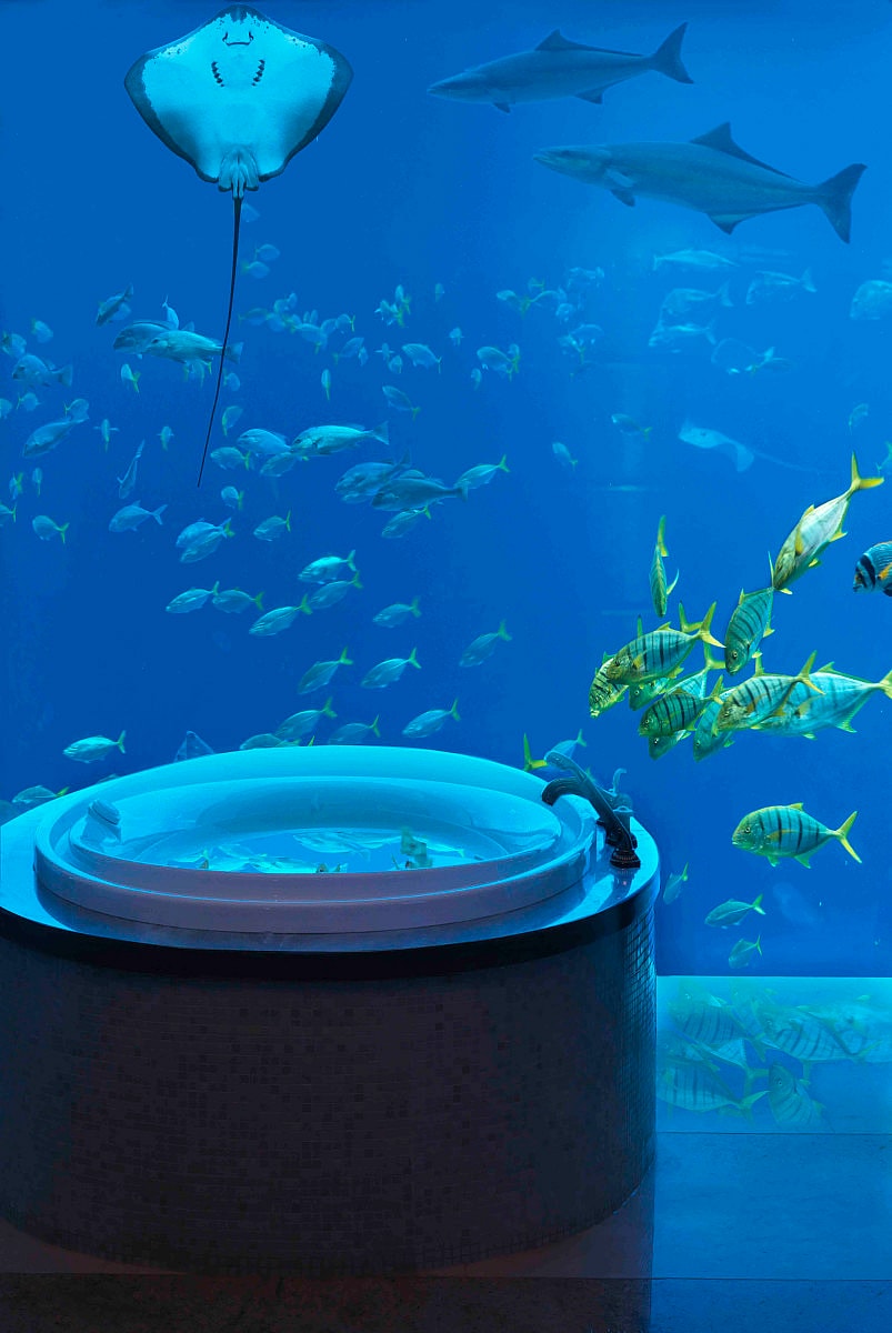 The Poseidon and Neptune Underwater Suites at Atlantis, The Palm in Dubai are surrounded by the Ambassador Lagoon–a three million gallon aquarium brimming with over 65,000 marine animals–that you can watch as you bathe with 24-karat gold flecked soap. Only in Dubai, right?